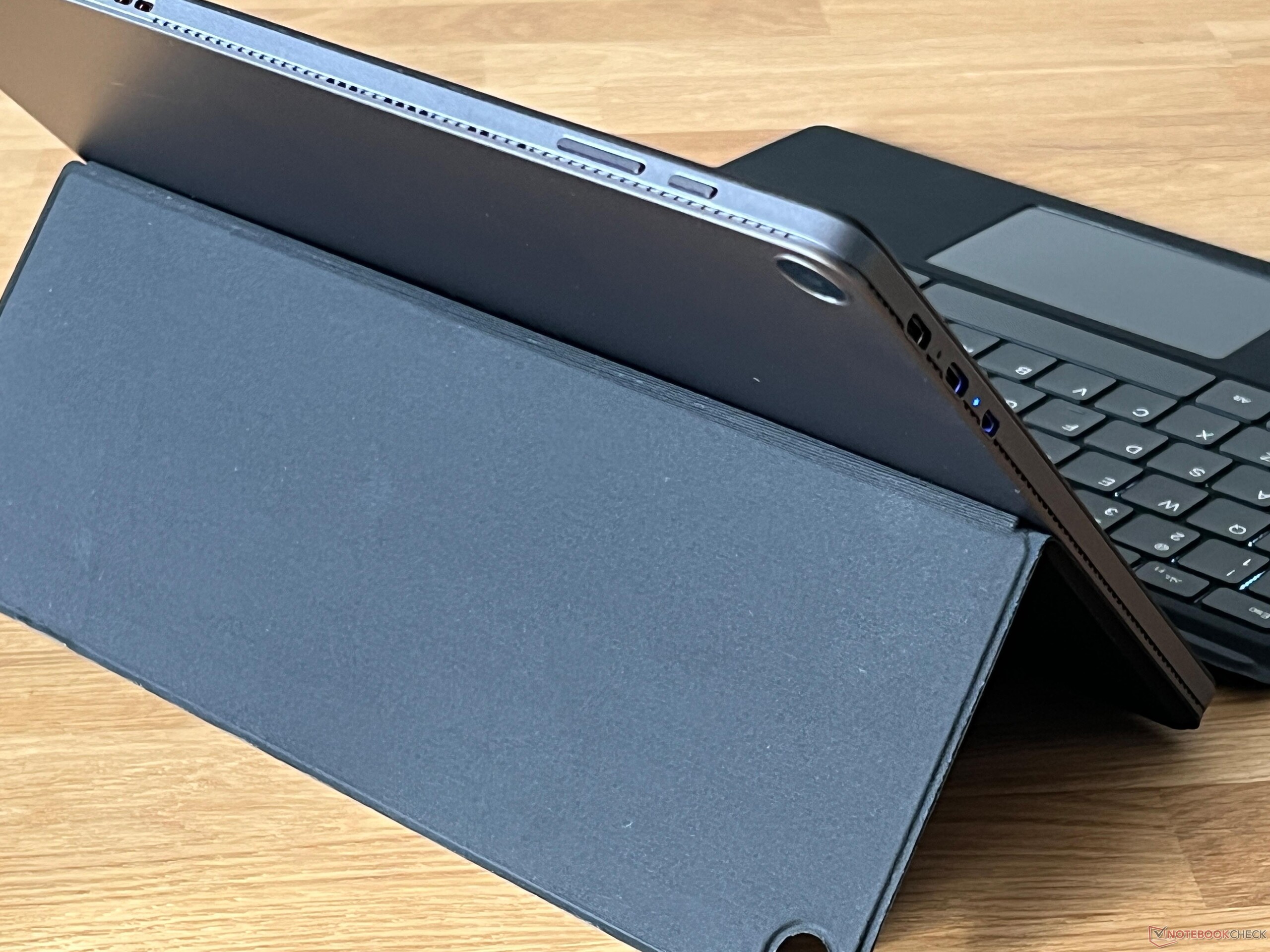 Hi10 Max är en surfplatta utan inbyggt kickstand. Chuwi använder en metallkonstruktion, och det mörkgrå höljet känns högkvalitativt, även om små knarrande ljud märks när enheten vrids. Skärmen kan också synligt pressas in med lite kraft, men detta påverkar inte funktionaliteten negativt. Normala pekinmatningar orsakar inte detta problem. I paketet ingår ett bakstycke med en kamerautskärning, vars nedre hälft fästs magnetiskt på höljet. Den övre delen kan vikas ned för att fungera som ett stativ, vilket fungerar bra i praktiken och ger ytterligare skydd. Det valfria tangentbordsskyddet är fäst på undersidan, men anslutningen är inte särskilt stabil och tenderar att lossna snabbt.