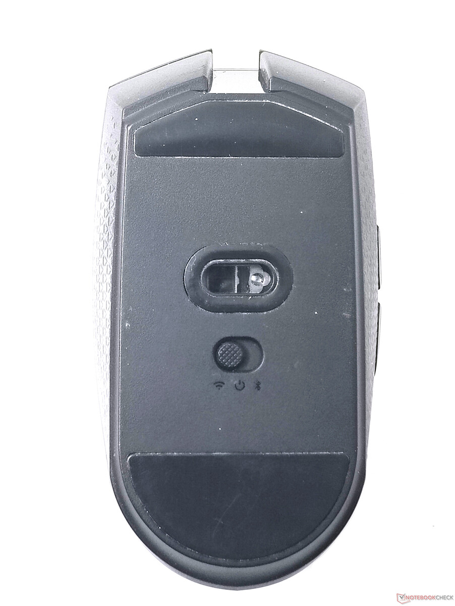 På undersidan hittar vi två musfötter - högst upp och längst ner vardera. Musfötterna behöver inte tas bort om du någonsin planerar att demontera musen, vilket är bra. Du får också se fönstret för PMW3325-sensorn och en strömbrytare som låter dig välja mellan Wi-Fi-, avstängnings- och Bluetooth-lägen.