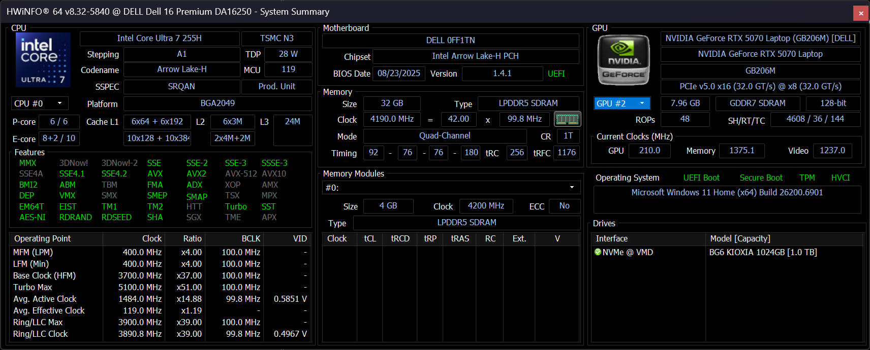 | Dell 16 Premium DA16250 Intel Core Ultra 7 255H ⎘ NVIDIA GeForce RTX 5070 Laptop ⎘ 32 GB Minne, 1024 GB SSD | Amazon: $3,599.00 Listpris: 3300 USD | 2.3 kg | 18.7 mm | 16.30" 3840x2400 278 PPI OLED | |