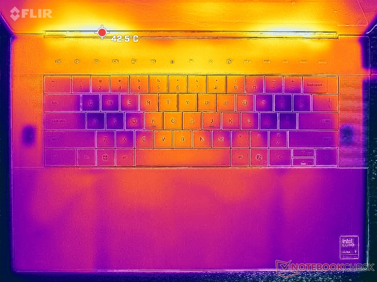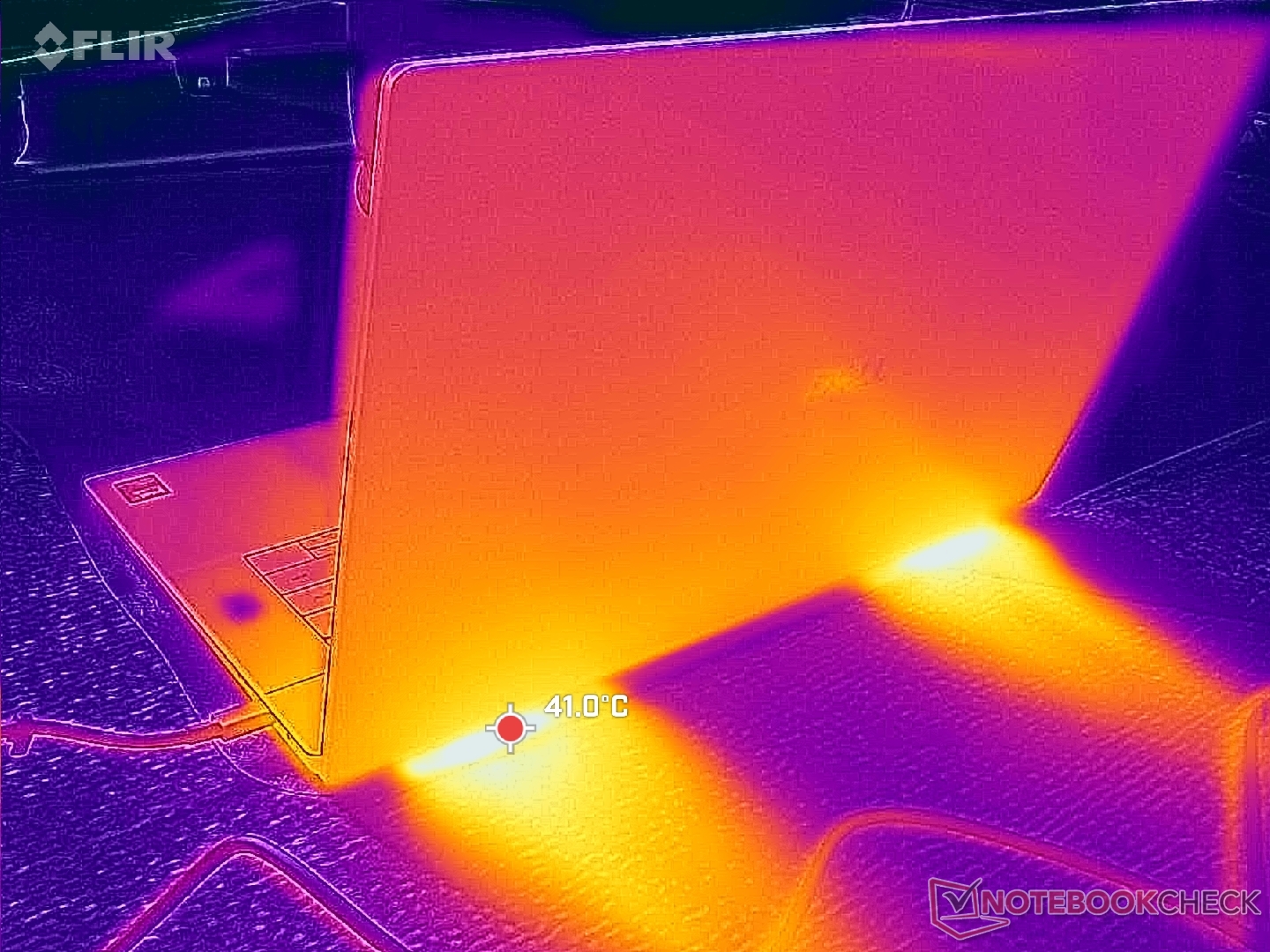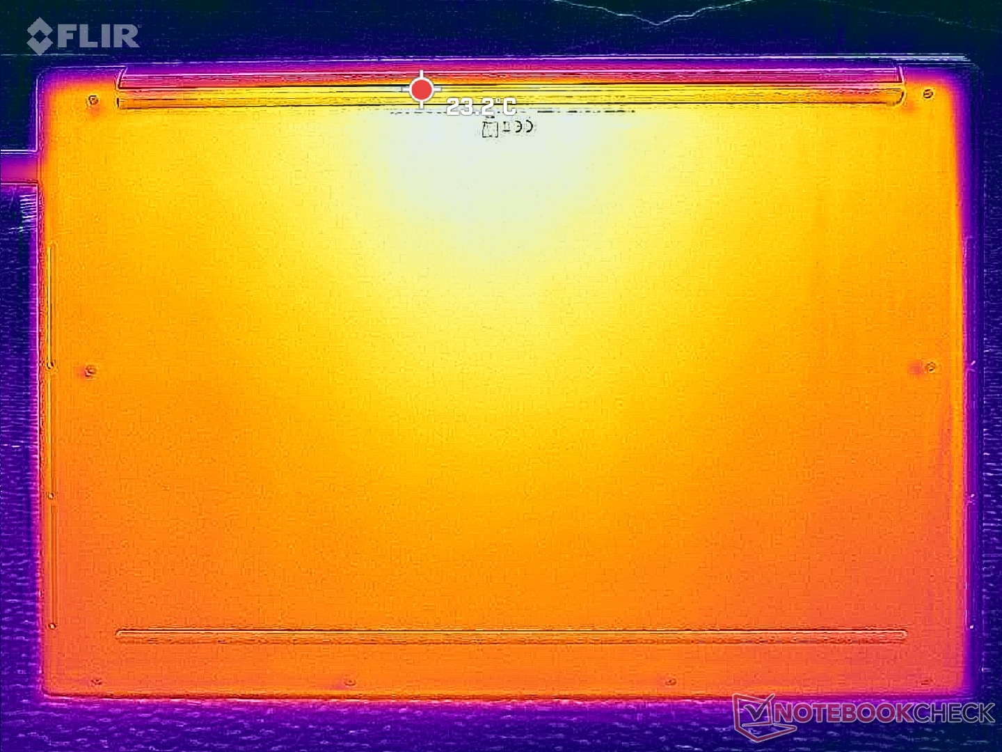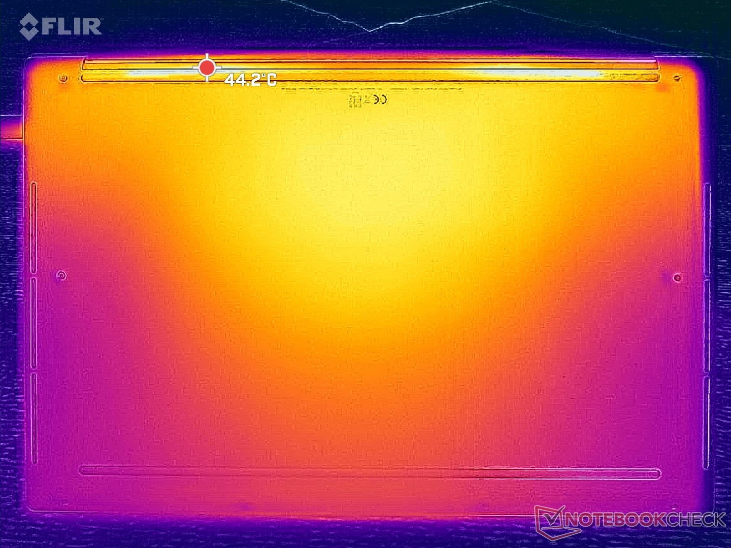 Heta punkter på undersidan nära ventilationshålen kan nå nästan 45 C när man kör krävande belastningar. Vi kan inte låta bli att undra om ytterligare ventilationshål skulle ha förbättrat den totala temperaturen, men Dell prioriterar helt klart en renare visuell design utan ventilationshål i stil med MacBook-serien.