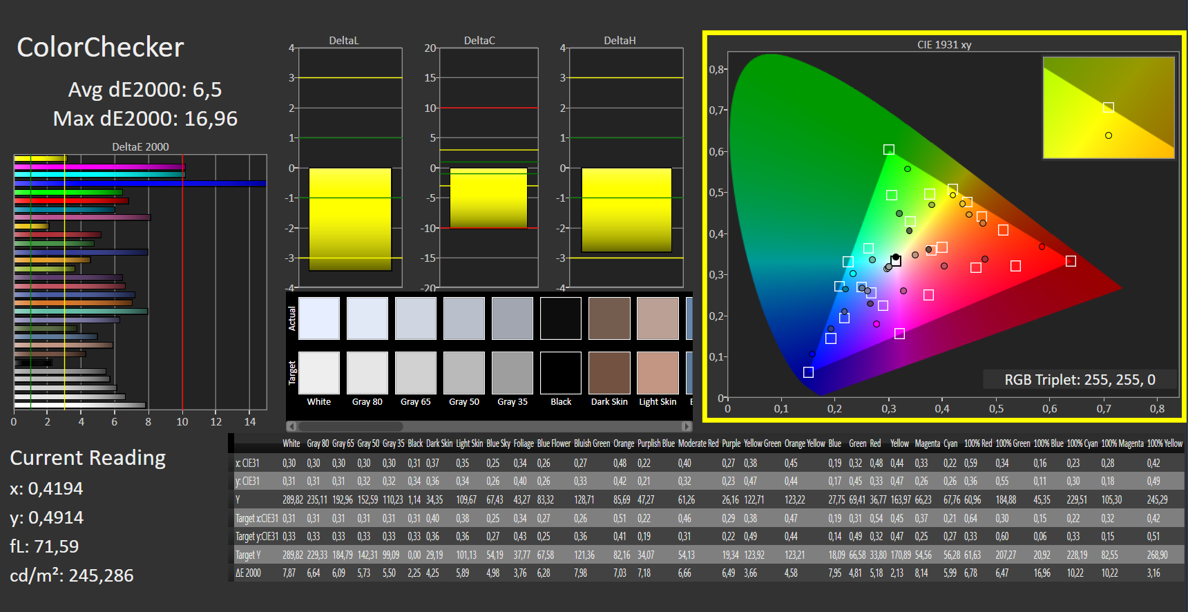 ΔE ColorChecker Calman: 6.5 | ∀{0.5-29.43 Ø4.78}