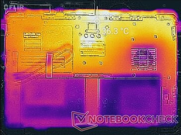 Yttemperaturen är aldrig obehagligt varm eftersom chassit är större än vanligt för en CPU i ULV U-serien. Vi kan registrera varma punkter på endast 31 C och 36 C på den övre respektive nedre ytan, jämfört med 37 C och 46 C på Acer Enduro Urban N3.