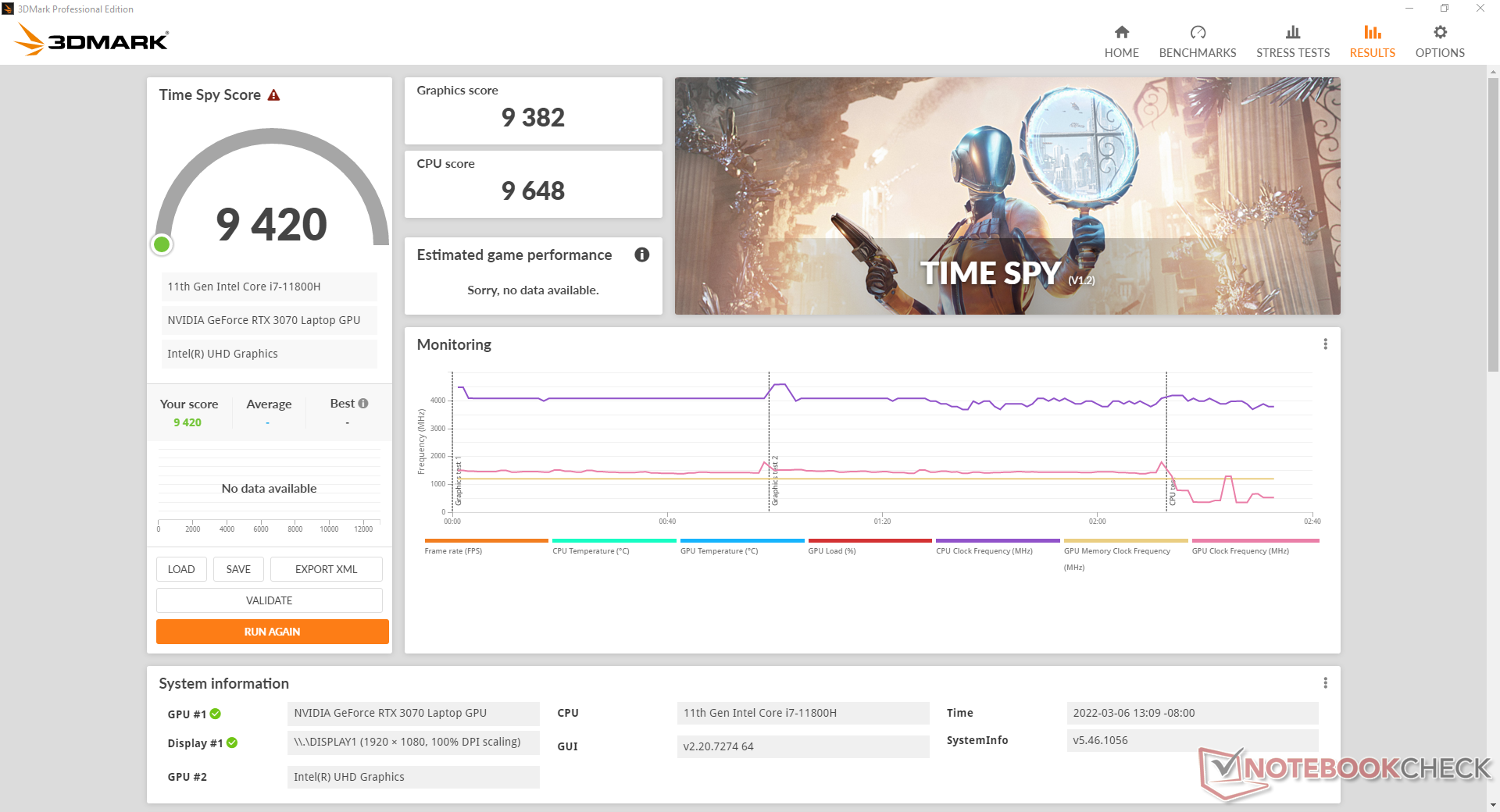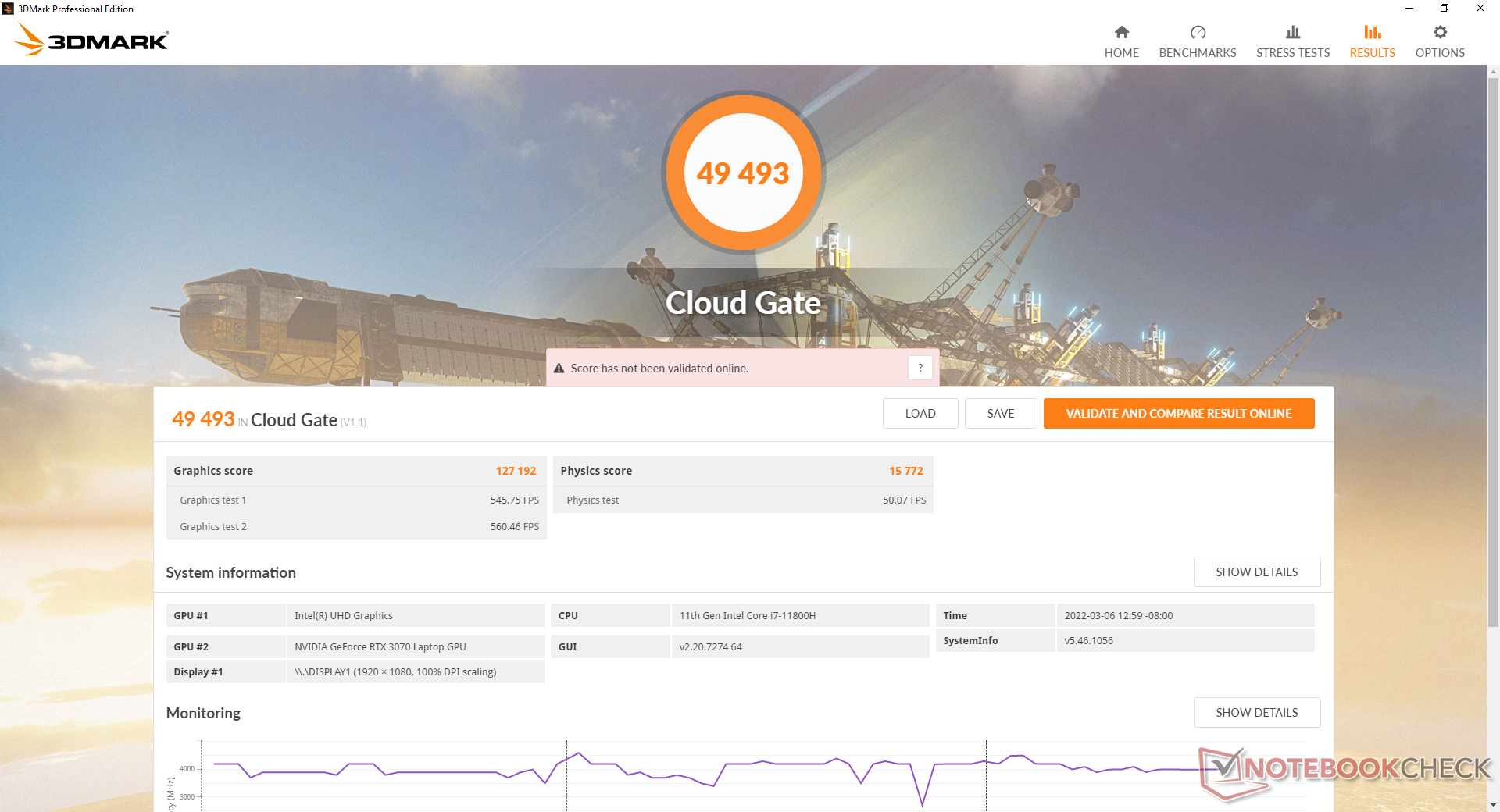 | Eurocom RX315 NH57AF1 Intel Core i7-11800H, NVIDIA GeForce RTX 3070 Laptop GPU | MSI Stealth GS66 12UGS Intel Core i7-12700H, NVIDIA GeForce RTX 3070 Ti Laptop GPU | Eurocom Nightsky ARX315 AMD Ryzen 9 5900X, NVIDIA GeForce RTX 3070 Laptop GPU | Alienware m15 R6, i7-11800H RTX 3080 Intel Core i7-11800H, NVIDIA GeForce RTX 3080 Laptop GPU | Dell G15 5515 AMD Ryzen 7 5800H, NVIDIA GeForce RTX 3050 Ti Laptop GPU | Razer Blade 15 Advanced (Mid 2021) Intel Core i7-11800H, NVIDIA GeForce RTX 3080 Laptop GPU | |