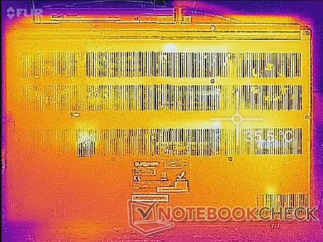 Yttemperaturen när du spelar kan vara så varm som 51 C nära tangentbordets mittpunkt jämfört med 44 C på Razer Blade 15. Precis som på de flesta bärbara datorer för spel är de två fläktarna placerade under WASD- och numpad-tangenterna för att hålla dessa delar av den bärbara datorn relativt svala oavsett belastning.