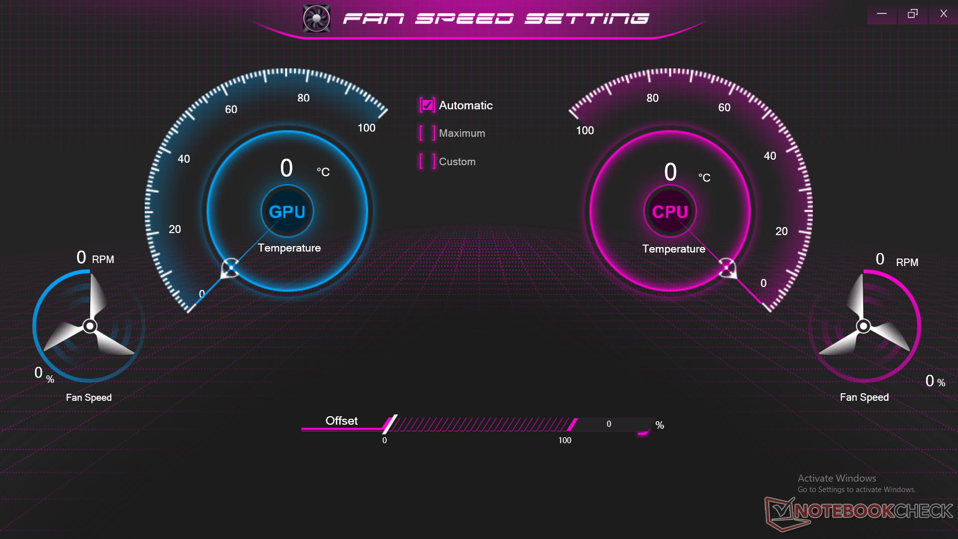 Det finns en liten ökning av grafikprestandan när man byter till prestandaläget från underhållningsläget. GPU-kortets strömförbrukning och klockfrekvens stabiliseras vid 118 W respektive 1620 MHz när Witcher 3 körs i prestandaläget jämfört med 113 W och 1530 MHz när samma spel körs i underhållningsläget. Om läget Maximal fläkt är aktiverat stabiliseras GPU-klockfrekvensen och kortets strömförbrukning vid ännu högre värden på 1725 MHz respektive 130 W. Det är en besvikelse att GPU:n inte kan nå närmare målet på 140 W som det påstås på Nvidias kontrollpanel och att användarna måste aktivera läget Maximal fläkt för att kunna pressa ut den förväntade prestandanivån ur GPU:n.