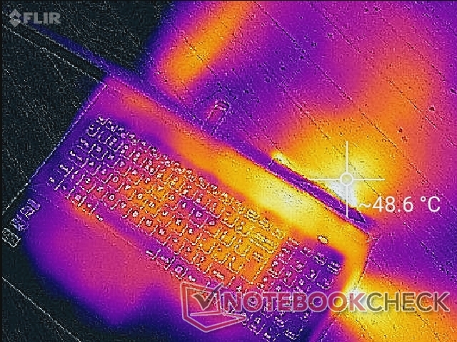 De heta punkterna på ytan är närmast vänster handflatsstöd och tangentbordets mitt när du kör krävande program. Det vänstra handflatsstödet är vanligtvis varmare än det högra eftersom PCIe4 NVMe SSD:n är placerad under det. Hot spots kan nå omkring 50 C på de övre och nedre områdena, vilket framgår av temperaturkartorna nedan.