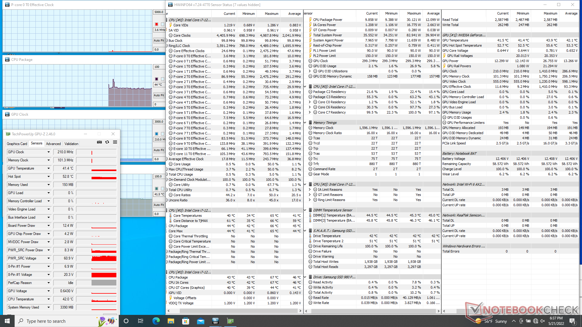 Strömförbrukningen är relativt låg när den går på tomgång på skrivbordet. Vår enhet förbrukar mellan 12 W och 22 W när den går på tomgång på skrivbordet jämfört med 33 W till 44 W på den mycket äldre Eurocom Sky X4C med en Intel 9th gen desktop CPU. Förbrukningen är dock fortfarande mycket hög när man kör mer krävande program. Körning av Witcher 3kräver till exempel mer ström än de flesta bärbara datorer med en Intel- eller AMD H-serie CPU och liknande GeForce RTX 3070-klass GPU.