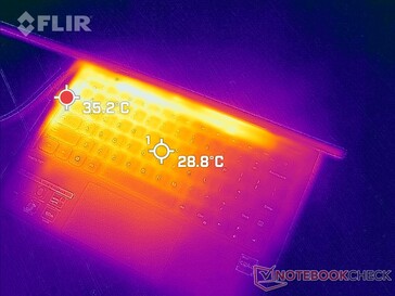 (+) Den maximala temperaturen på ovansidan är 36.2 °C / 97 F, jämfört med genomsnittet av 35.9 °C / 97 F , allt från 21.4 till 59 °C för klassen Subnotebook.
