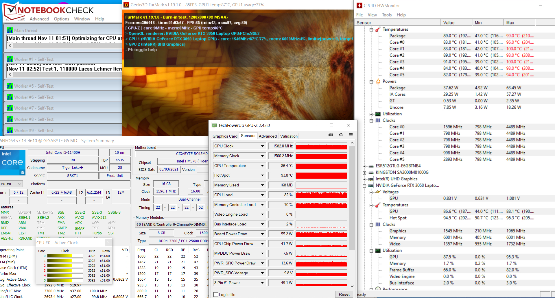 Processorn och grafikprocessorn klarar stresstestet (Prime95 och FurMark körs i minst en timme) med 2,6-3,1 GHz respektive cirka 1 600 MHz. Testet utgör ett extremt scenario som vi använder för att kontrollera om systemet förblir stabilt under full belastning