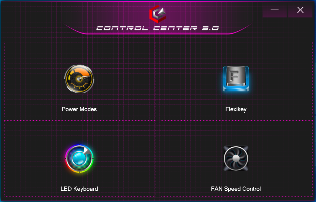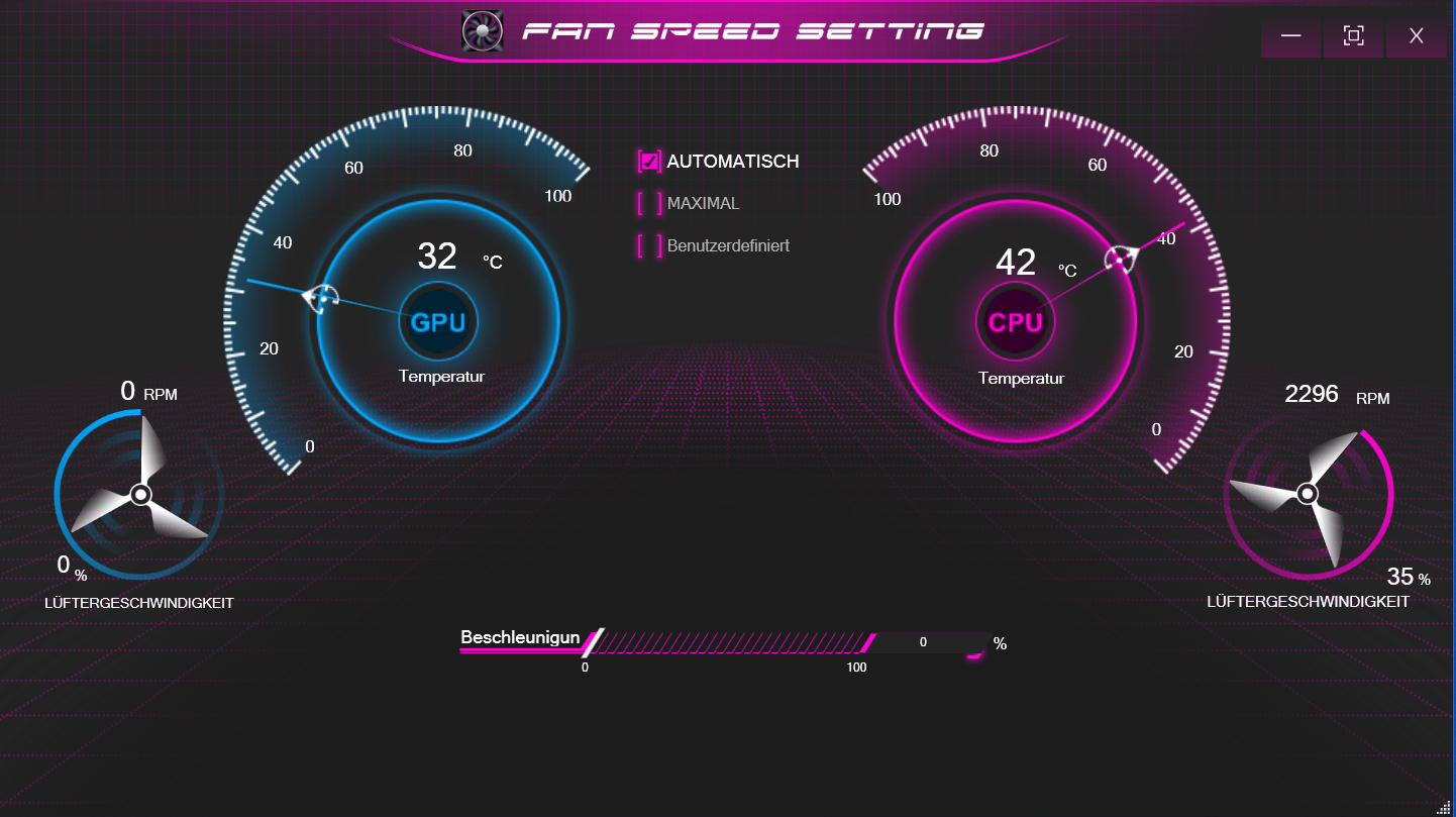 I det förinstallerade kontrollcentret kan du bland annat välja en prestandaprofil (se tabell). Vi använde profilen "Entertainment Mode" med automatisk fläktstyrning. Vi utförde även några benchmarks under profilerna "Performance Mode" och "Power Saving Mode". Resultaten finns i jämförelsetabellerna.