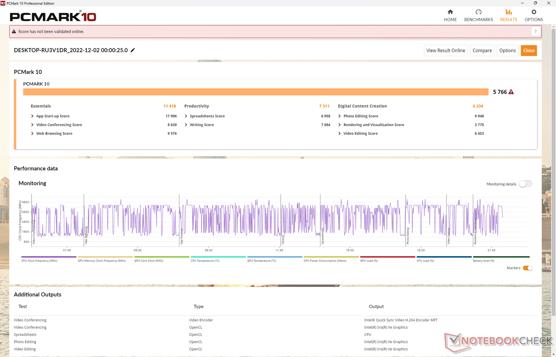 När Prime95 körs ökar processorn till 3,5 GHz och 49 W under de första sekunderna tills den når en kärntemperatur på 69 C. Därefter sjunker klockfrekvensen och strömförbrukningen till endast 2,3 GHz respektive 20 W för att bibehålla en kärntemperatur på endast 60 C. De flesta andra bärbara datorer har vanligtvis mycket högre kärntemperaturtak och därför är det låga 60 C-värdet oväntat. Core i7-1265U i den Latitude 7330kan till exempel nå 85 C och 2,5 GHz vid samma Prime95-test.