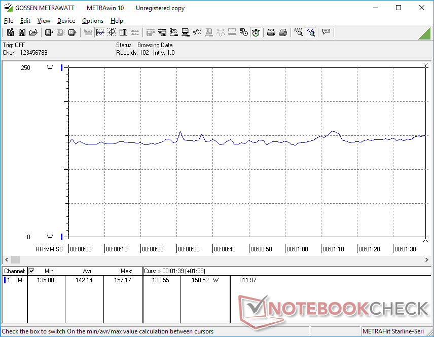 Strömförbrukningen är relativt hög över hela linjen. Tomgångskörning på skrivbordet, till exempel, skulle förbruka drygt 19 W även med energisparprofil och lägsta ljusstyrka jämfört med 7 W eller 16 W på ThinkPad P16 G1 respektive Precision 7670. Att köra mer krävande belastningar som Witcher 3 skulle förbruka 189 W eller nästan 30 W mer än på Precision 7670, trots att Dell har något snabbare grafikprestanda.