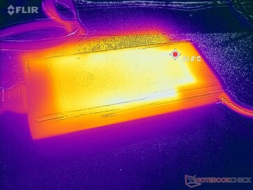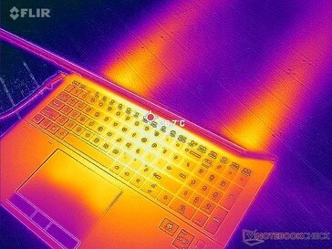 Yttemperaturen tenderar att bli varmare mot tangentbordets mitt där den kan nå över 36 C vid extrema processbelastningar. Temperaturutvecklingen är mer symmetrisk än på Precision 7670 eller ThinkPad P16, men pekplattan och handflatestödet kan bli varmare än vi skulle vilja. Vid krävande belastningar kan till exempel pekplattan på HP nå över 35 C jämfört med 30 C eller lägre på de tidigare nämnda Lenovo- och Dell-alternativen.