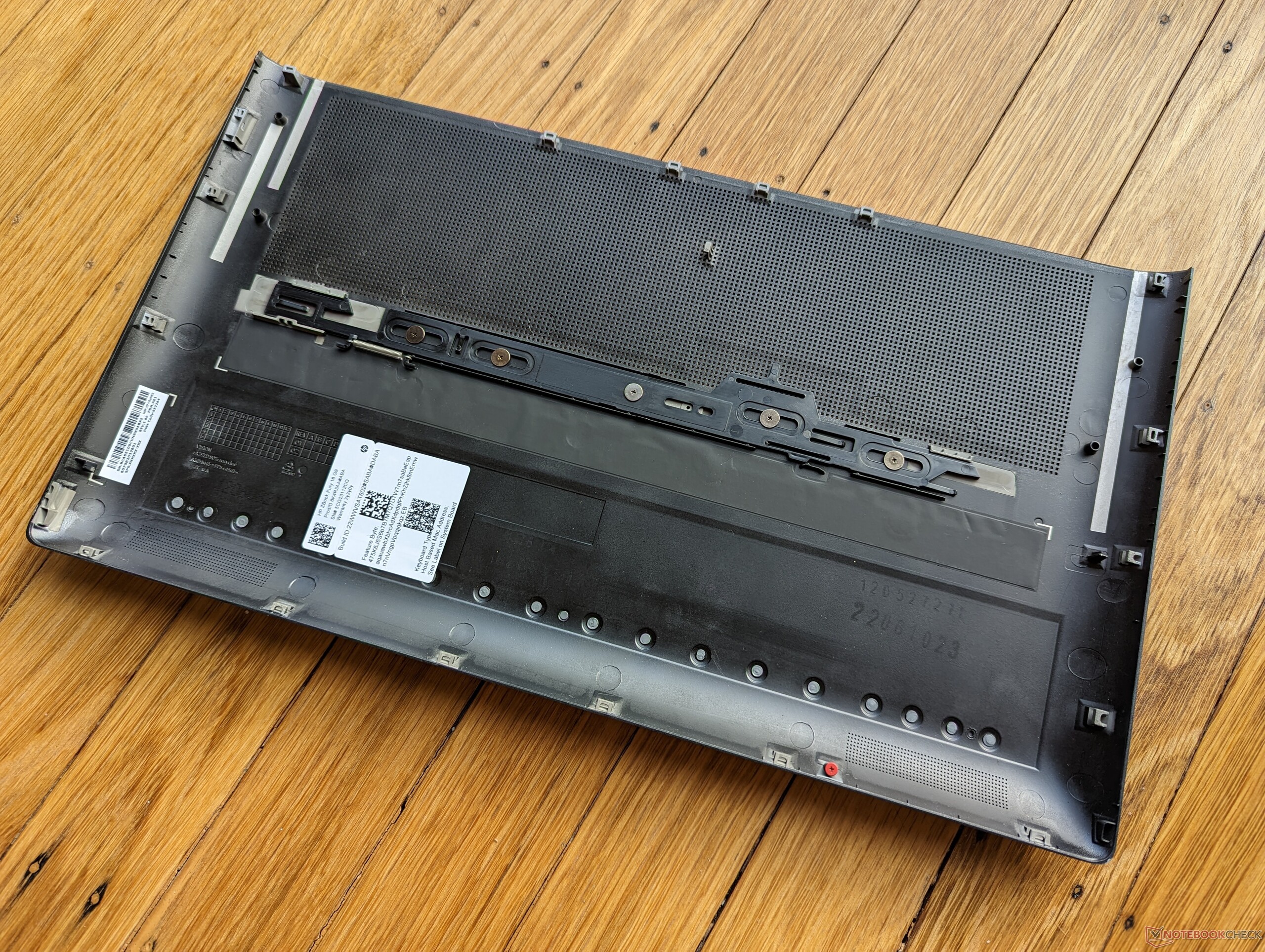 Den nedre panelen är "toolless", vilket innebär att den enkelt kan tas bort utan verktyg. Tyvärr krävs det fortfarande en skruvmejsel eftersom lagringsfacken och SODIMM-kortplatserna skyddas av aluminiumplattor. Modellen stöder upp till 4x M.2 2280 SSD-enheter och 4x DDR5 RAM-moduler, vilket är mer än vad Precision 7670 och ThinkPad P16 kan erbjuda.