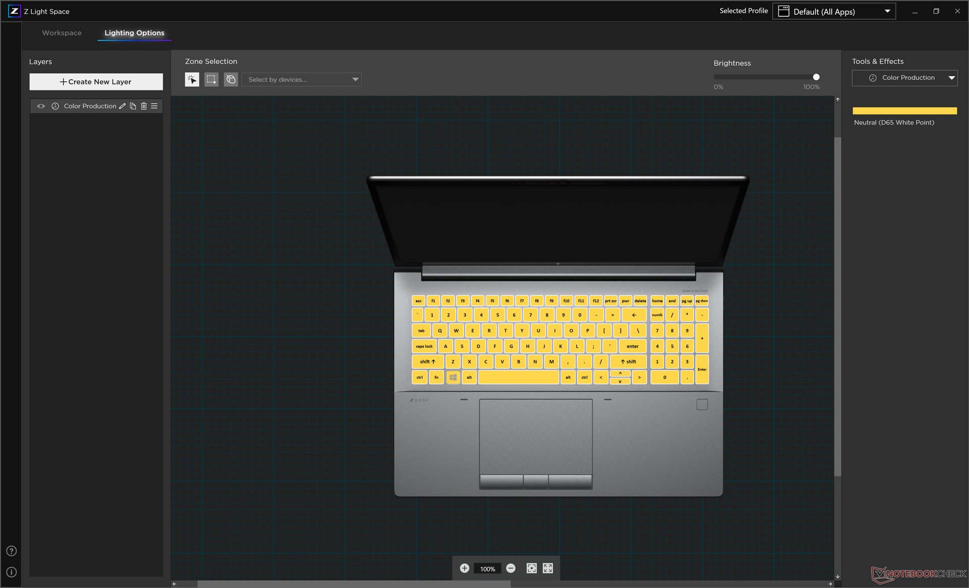 Utmärkande egenskaper hos ZBook-tangentbordet är RGB-bakgrundsbelysning per tangent och en enda programmerbar/anpassningsbar tangent. De flesta andra arbetsstationer har ännu inte liknande extrafunktioner.