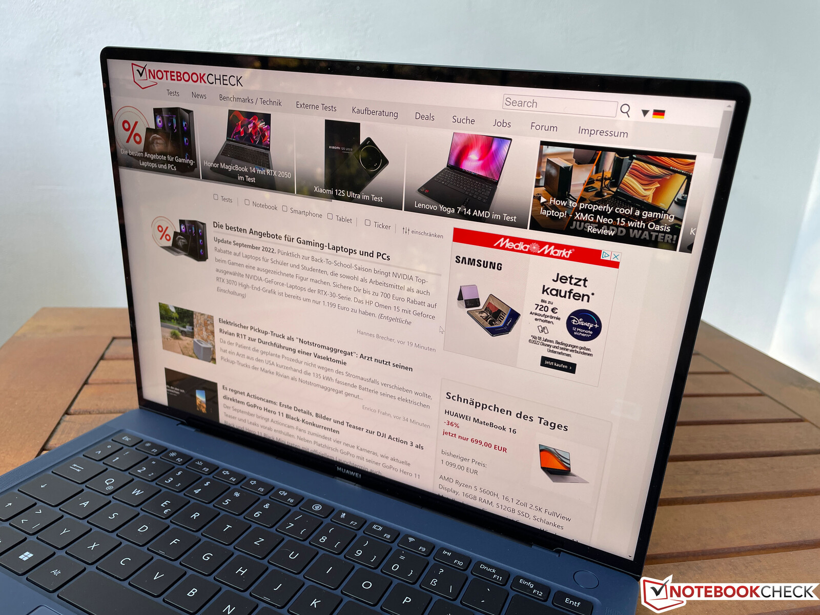 Huawei fortsätter att använda en 3:2 IPS-display som iföregångarenmen har ökat skärmens diagonal från 13,9 till 14,2 tum. Upplösningen är också minimal med 3120x2080 pixlar, vilket resulterar i en hög pixeltäthet på 264 DPI. Det subjektiva bildintrycket av den kapacitiva pekskärmen är utmärkt, eftersom färgerna framstår som mycket rika och innehållet är extremt skarpt. Dessutom erbjuder skärmen en högre uppdateringsfrekvens på 90 Hz, vilket möjliggör ett mycket jämnare bildintryck vid uppspelning av visuella medier. Detta måste dock först aktiveras manuellt, antingen i bildskärmsinställningarna eller via tangentkombinationen Fn+R. Ljusstyrkan kan regleras automatiskt via en sensor och färgtemperaturen kan också anpassas till ljusförhållandena