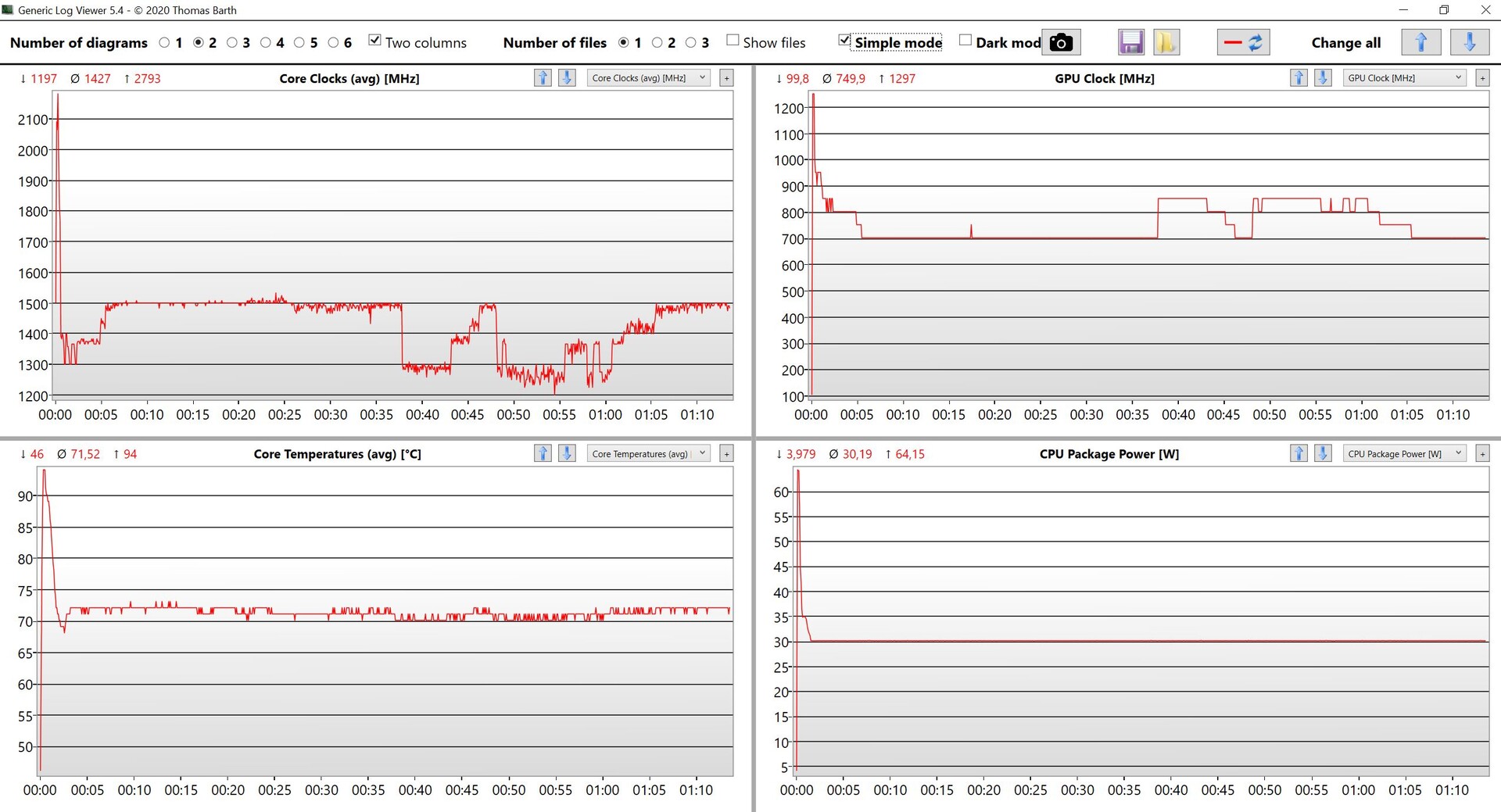 Alder Lake Core i7-1260P och rimliga effektnivåer möjliggör utmärkt systemprestanda, men det finns snabbare konkurrenter när det gäller ren CPU-prestanda. I praktiken är balanserat läge helt tillräckligt, särskilt eftersom du drar nytta av mycket tystare fläktar; med maximalt ~33 dB(A) i balanserat läge är MateBook X Pro en av de tystaste modellerna. Endast den passivt kylda MacBook Air M2 har en fördel här. Huawei slösar bort en del potential i SSD-enheten, eftersom det inte finns någon PCIe 4.0-enhet och placeringen på kylflänsen orsakar prestandaförluster efter en tid. Trots detta bör detta inte vara ett problem för de allra flesta användare i vardagen.