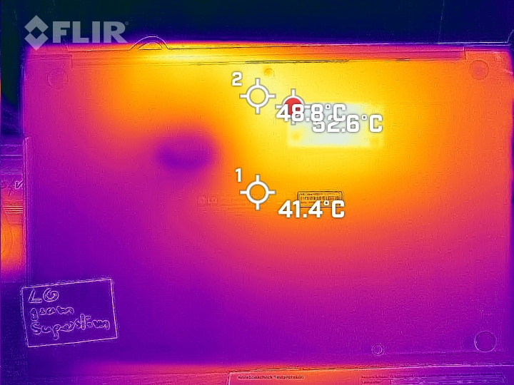 Under belastning värms den bärbara datorn upp betydligt på vissa ställen, men endast måttligt överlag. Vi uppmätte maximalt 50,4 °C (~123 °F) på ett ställe under stresstestet. Vid daglig drift håller sig temperaturerna inom det gröna området.