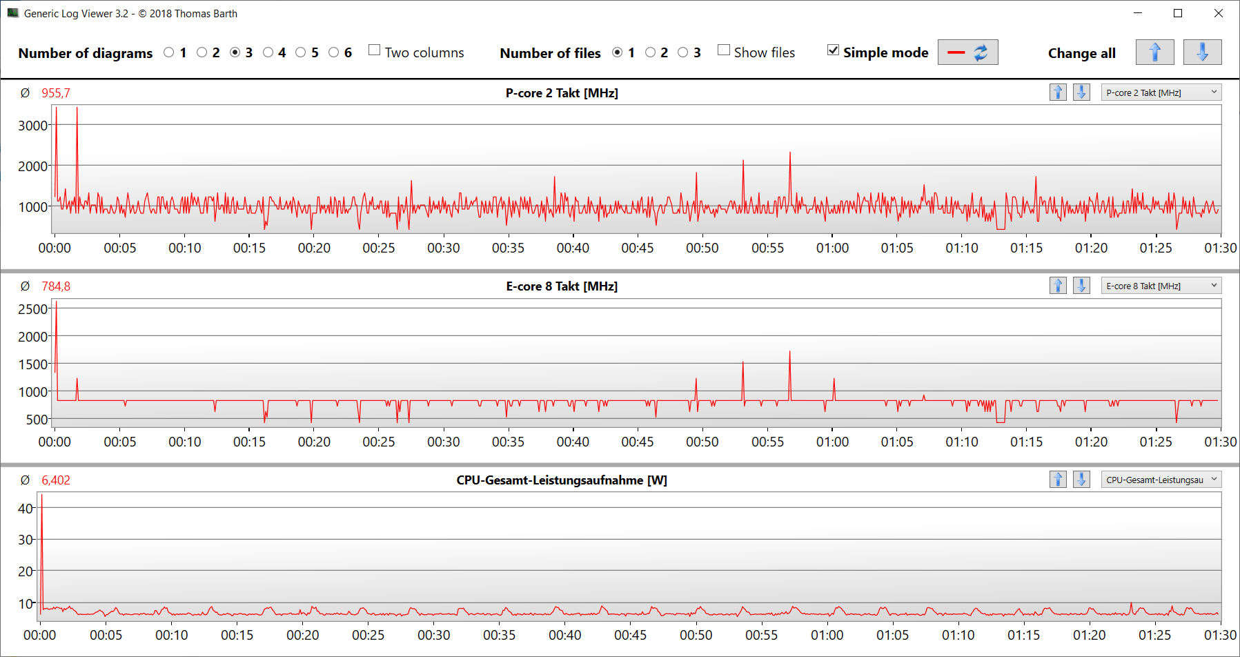 Stresstestet (med Prime95 och Furmark som körs konstant) representerar ett extremt scenario som vi använder för att utvärdera systemstabiliteten under full belastning. Redan i början av testet körs CPU (P: 2 GHz; E: 1,5 till 1,6 GHz) och GPU (850 MHz) med låga klockfrekvenser, och värdena sjunker ytterligare under testets fortsättning.