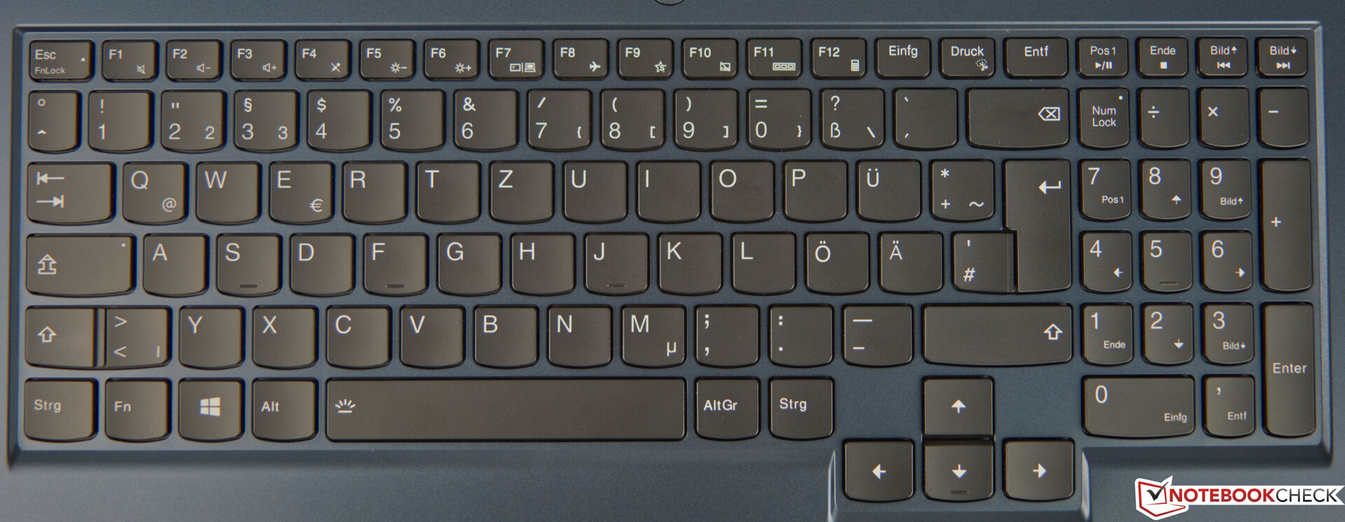 Lenovo utrustar Legion 5 17 med ett chiclet-tangentbord med sex rader och subtil bakgrundsbelysning med två ljusstyrkor. Om du vill kan bakgrundsbelysningen också stängas av helt och hållet. Tangenterna är tillräckligt stora och piltangenterna är normalstora. Den grunda rörelsen på endast 1,5 mm åtföljs av en något matt återkoppling och en tydlig aktiveringspunkt. Som ett resultat av detta känns tangenterna inte svampiga