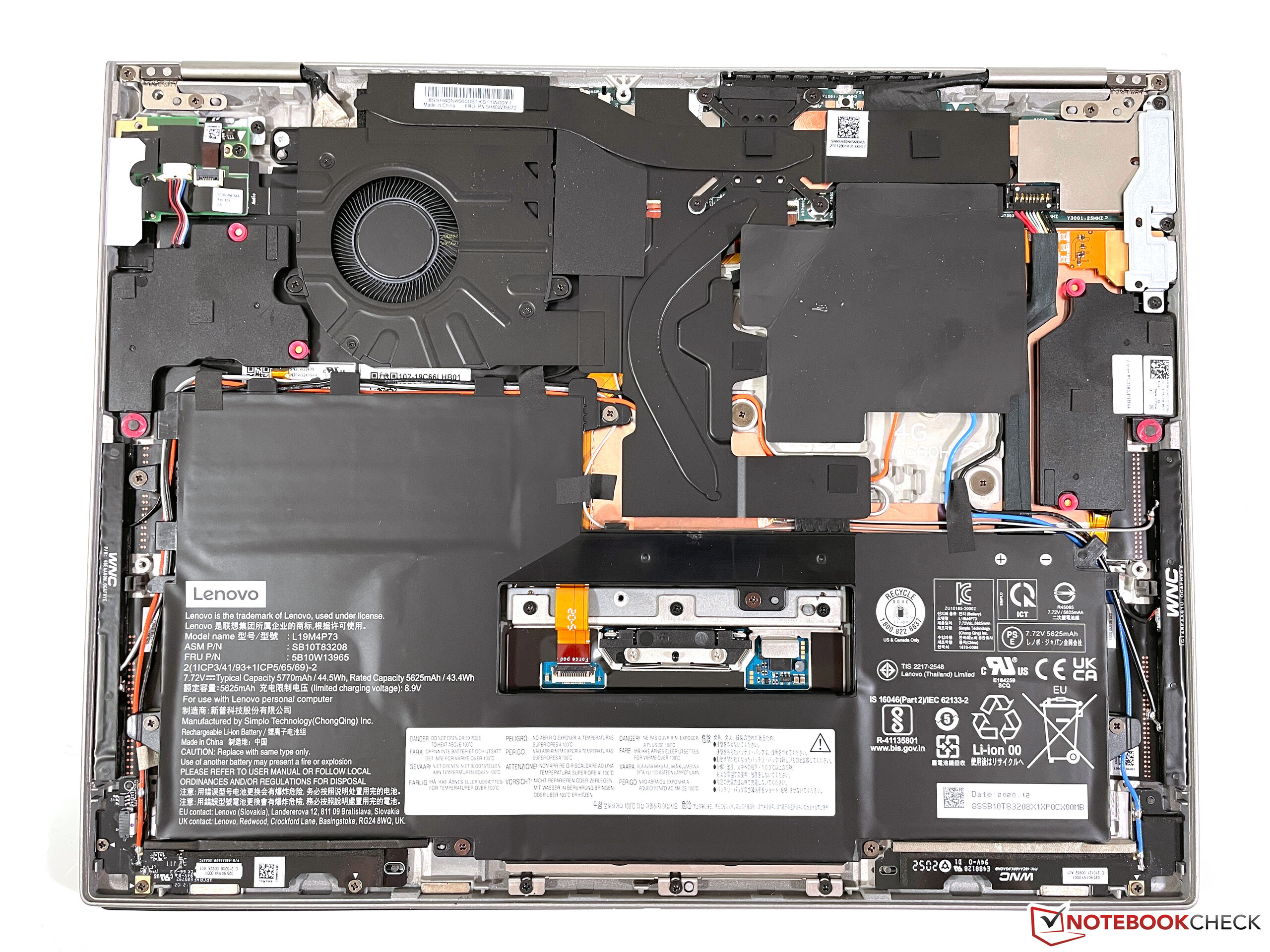 Lenovo förser processorn och GPU:n med 8-16 GB snabbt LPDDR4X-4266-minne, som är fastlödda på moderkortet. Åtta gigabyte arbetsminne erbjuds uteslutande i kombination med i5-processorerna. För SSD:n väljer Lenovo den ovanliga formfaktorn M.2 2242 med enkelsidig montering. Det finns endast en M.2-plats för SSD:en.