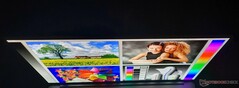 4K-panelen, som är det enda alternativet i USA, är begränsad till 60 Hz och kommer förmodligen att minska batteritiden ännu lite mer. Vi uppfattar redan 3K-skärmen som en mycket skarp skärm av högsta klass. Det är samma skärm som finns i Yoga 9 cabriolet, förresten. Lenovo lovar 400 nits ljusstyrka, medan vi uppmätte 367 nits i genomsnitt, vilket borde räcka för daglig användning inomhus. För utomhusbruk är den starkt reflekterande glasytan inte fördelaktig. Men genom att aktivera HDR500 kan den ökas något, med 617 nits toppljusstyrka på en helt vit bakgrund (ej uppmätt). I batteriläge måste du välja "optimera för bildkvalitet" i Windows HDR-inställningar.