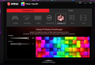 Med den förinstallerade MSI True Color-programvaran kan användaren justera färgerna för ett visst färgutrymme eller användningsområde. Vi använde förinställningen "Display P3". Men: Färgnoggrannheten är ganska dålig från fabrik - oavsett val av förinställning. Alla färger verkar överdrivna och mjölkaktiga med mätningar som är helt fel. Detta kan inte vara vad MSI avsett.