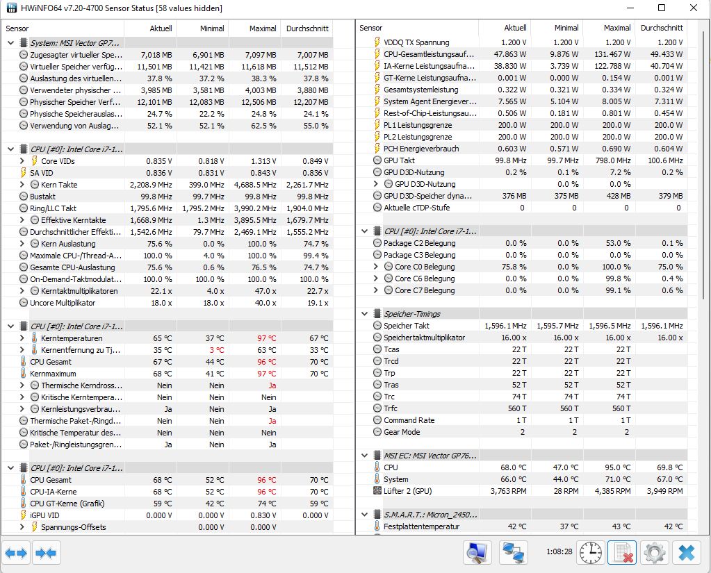 Vid 2,3 GHz arbetar CPU:n endast 100 MHz under basklockfrekvensen i det kombinerade stresstestet (Prime95 + FurMark), medan den mindre Vector GP66 endast klarar 1 GHz. GPU:n kan också prestera med full klockfrekvens i detta extrema scenario. Så strypning kommer inte in i bilden, och ingen prestandaförlust kan ses i 3D-jämförelsetestet direkt efter stresstestet.