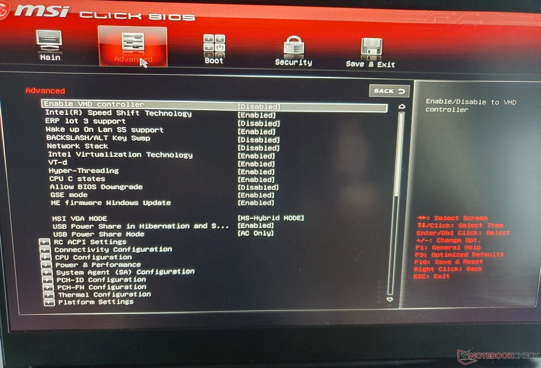 BIOS kan vanligtvis nås på bärbara MSI-speldatorer via kombinationen "F1 + DEL". Vid första anblicken finns det inte mycket att se, men tangentkombinationen "Shift (höger) + CTRL (höger) + ALT + F2" låser upp alla möjliga BIOS-funktioner, från prestandagränsvärden, termiska inställningar till överklockningsmöjligheter (på egen risk, förstås).
