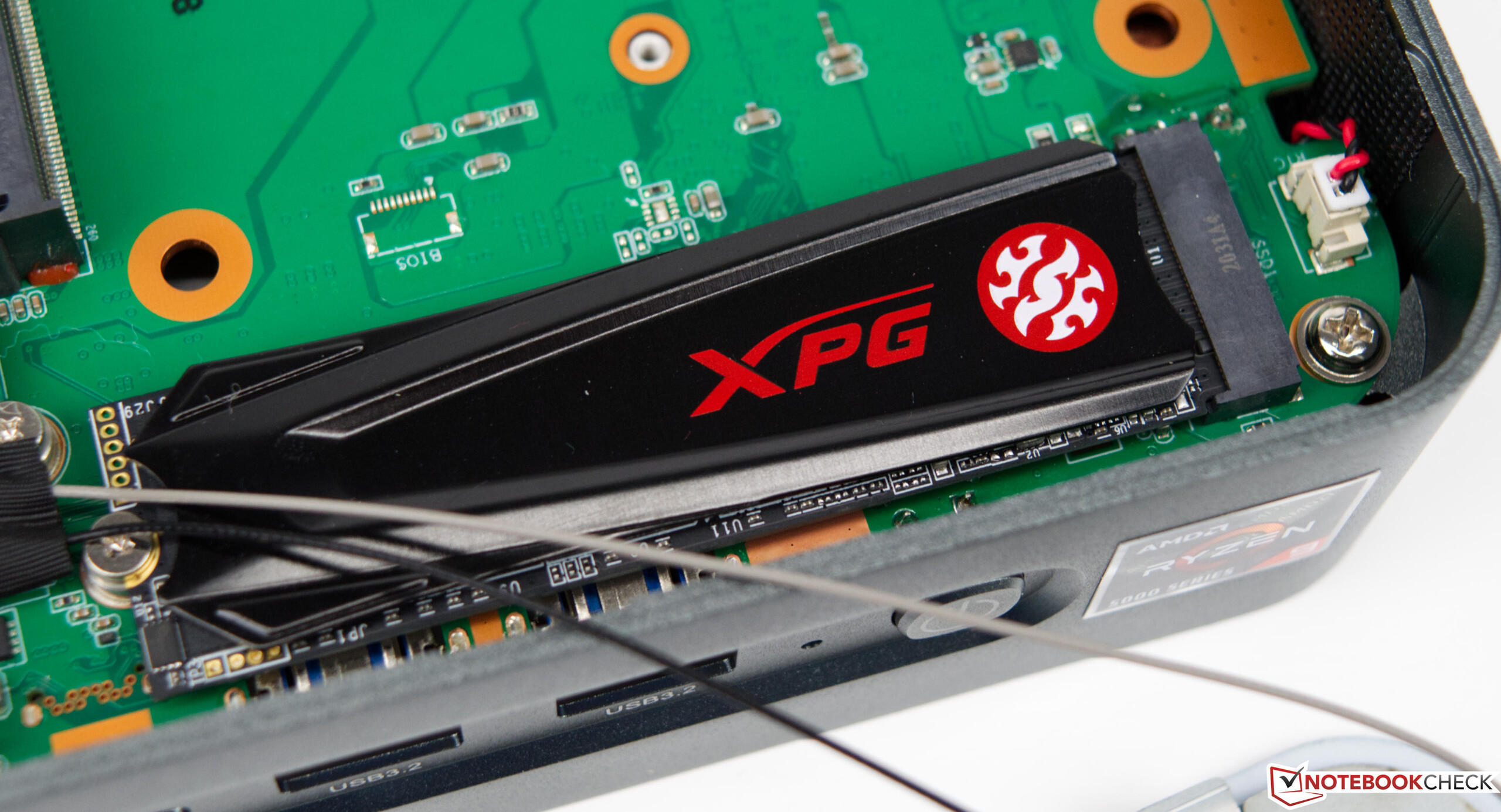 Interiören kan nås mycket snabbt. Du bör dock veta att de övre och nedre sidorna kan tas bort individuellt. Ovansidan är endast säkrad med två små skruvar, och efter att ha tagit bort dem kan du komma åt den inbyggda SSD:n samt RAM-minnet. En extra lagringsenhet i 2,5-tumsformat kan också installeras här. Botten är säkrad med fyra skruvar som är placerade direkt under de fastlimmade fötterna. Kylenheten är placerad under det nedre locket samt ytterligare en plats för att montera en M.2 SSD.