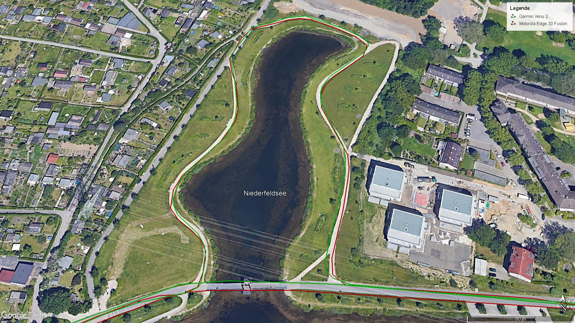 Jämförelsen med vår referensenhet, Garmin Venu 2, visar en övertygande satellitanslutning. Rutten visas exakt på kartan, och även svängar och kurvor registreras smidigt.