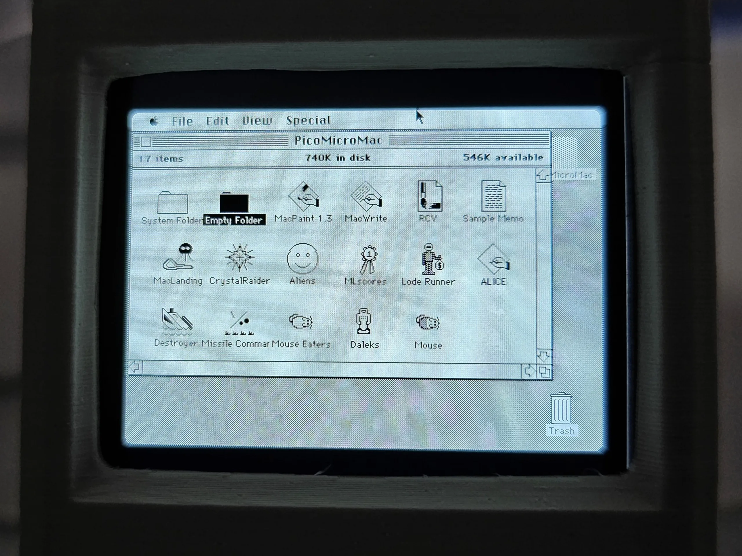 | Modifierad Raspberry Pi Pico med flashad firmware och förinstallerad Macintosh System 3.2 startdiskett |