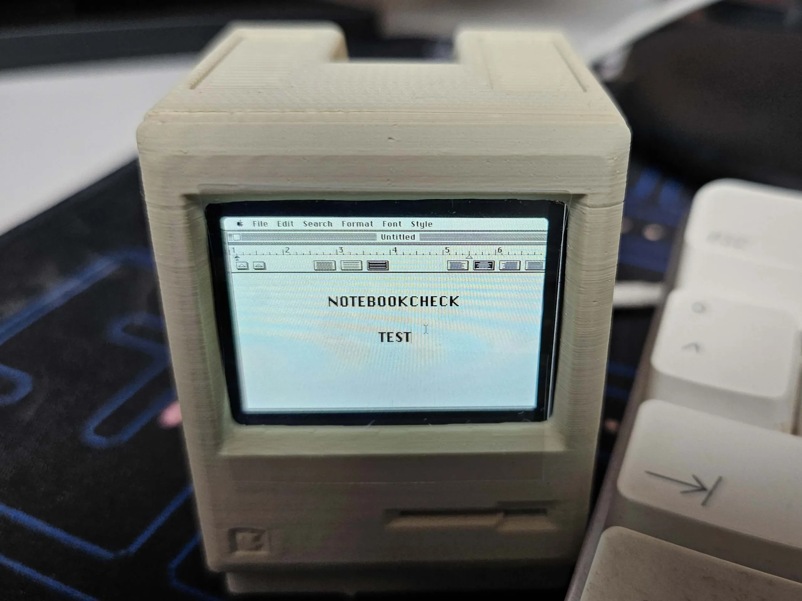 Pico Mac Nanos hölje är 3D-utskrivet och tillverkat av PLA-bioplast. Denna kan mjukna vid temperaturer över 60 °C, så det är viktigt att inte utsätta enheten för alltför hög värme. En ljudmodul finns som tillval för att integrera det typiska startljudet, liksom en batterimodul för att använda Pico Mac Nano som strömkälla utan USB-kabel. Jag bestämde mig för att inte använda någon av dessa. För att starta Micro Macintosh behöver du bara ansluta en USB-C-kabel till den bakre porten och efter en kort startprocess är System 3.2 redo att användas.