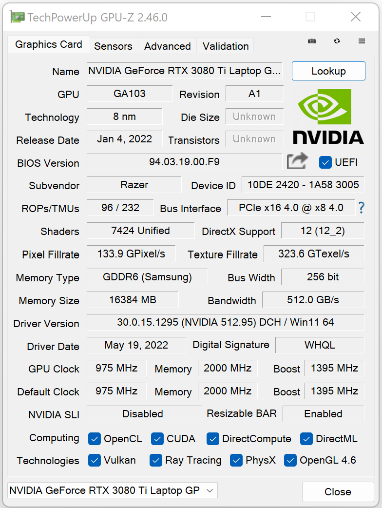 | Razer Blade 17 Early 2022 GeForce RTX 3080 Ti Laptop GPU, i9-12900H, Samsung PM9A1 MZVL21T0HCLR | Alienware x17 R2 P48E GeForce RTX 3080 Ti Laptop GPU, i9-12900HK, 2x Samsung PM9A1 1TB (RAID 0) | Medion Erazer Beast X30 GeForce RTX 3080 Ti Laptop GPU, i9-12900HK, Samsung PM9A1 MZVL21T0HCLR | MSI Stealth GS77 12UHS-083US GeForce RTX 3080 Ti Laptop GPU, i7-12700H, Micron 3400 1TB MTFDKBA1T0TFH | Razer Blade 17 RTX 3080 Ti GeForce RTX 3080 Ti Laptop GPU, i7-12800H, Samsung PM9A1 MZVL21T0HCLR | |
