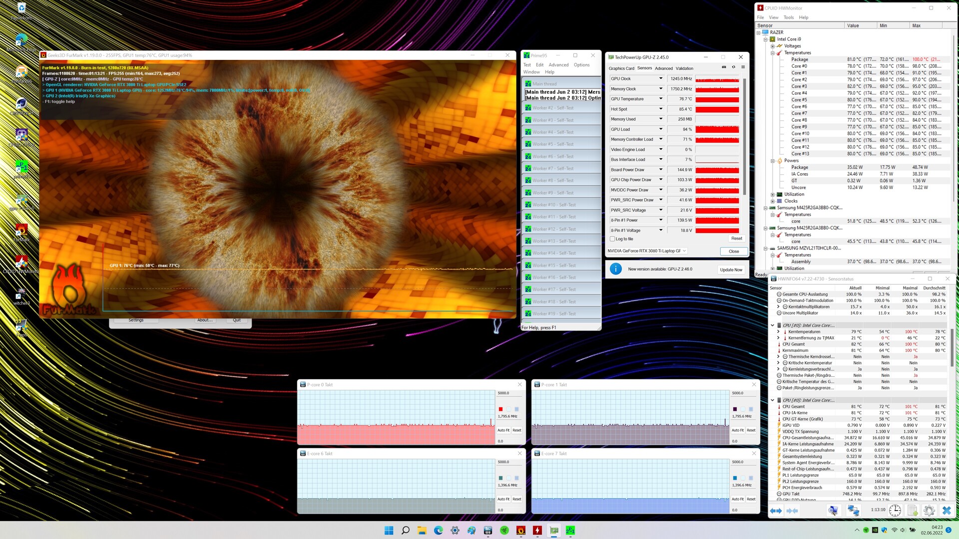 Redan i början av stresstestet (med Prime95 och Furmark igång i minst en timme) körs processorn med låga klockfrekvenser (P-kärnor: 2,1-2,2 GHz; E-kärnor: 1,6-1,7 GHz). När man fortsätter sjunker värdena till 1,8 GHz för P-kärnorna och 1,4 GHz för E-kärnorna. GPU:s klockfrekvens sjunker från cirka 1 500 MHz till cirka 1 250 MHz. Stresstestet representerar ett extremt scenario och vi använder det för att utvärdera om systemet förblir stabilt vid full belastning.