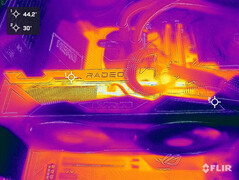 Den något förbättrade prestandan hos AMD Radeon RX 6650 XT jämfört med AMD Radeon RX 6650 XT AMD Radeon RX 6600 XT orsakar en något högre strömförbrukning. Vi uppmätte ett genomsnittligt energibehov på 339 watt när vi spelade. Tillverkaren har använt en mycket bra kylare med stor yta, inklusive en reviderad fläkt, som tack vare den nya designen gav ett högre luftflöde och därmed gör det möjligt för grafikkortet att arbeta tystare och svalare.