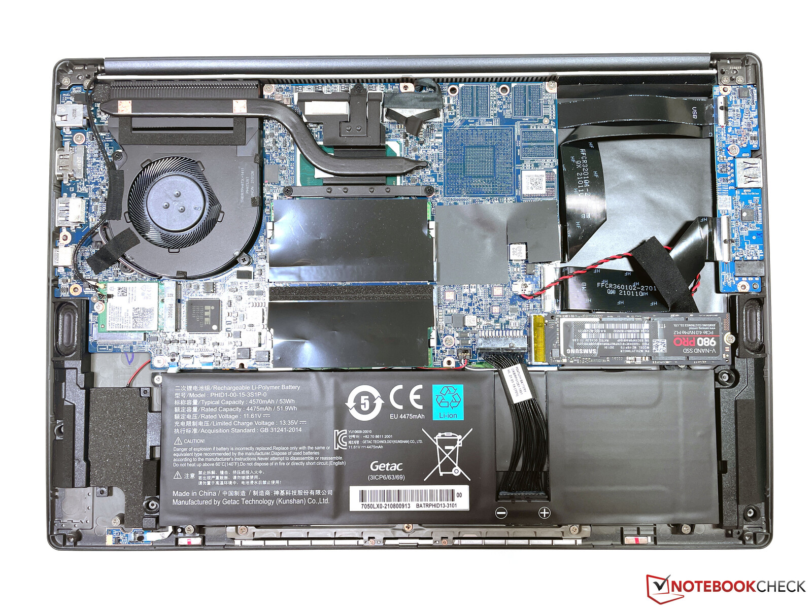 Efter att ha öppnat höljet kan du se den förbättrade kylningen med den andra fläkten och det extra värmeröret. De mycket bra underhålls- och uppgraderingsalternativen som inkluderar två SODIMM-platser (max. 64 GB RAM) och två fullfjädrade M.2 2280-platser (1x PCIe 4.0 och 1x PCIe 3.0 x2) samt den utbytbara WLAN-modulen finns fortfarande kvar i H35-modellen av Vision 14