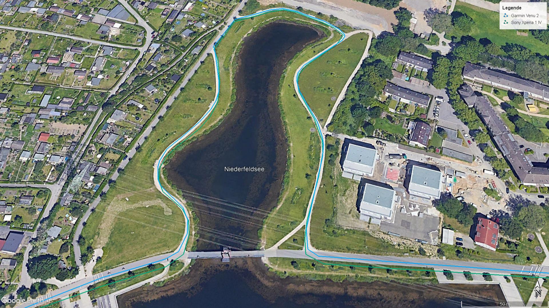 För att bättre kunna bedöma positioneringsnoggrannheten vid daglig användning tog vi med Sony-smarttelefonen på en kort resa och registrerade rutten tillsammans med en Garmin Venue 2 för att jämföra. Positioneringsmodulen i Xperia 1 IV använder satellitsystem från GPS (L1), GLONASS, QZSS till Galileo (E1) för lokalisering, men endast i single-band. Det satellitbaserade tilläggssystemet SBAS kommer också in i bilden
