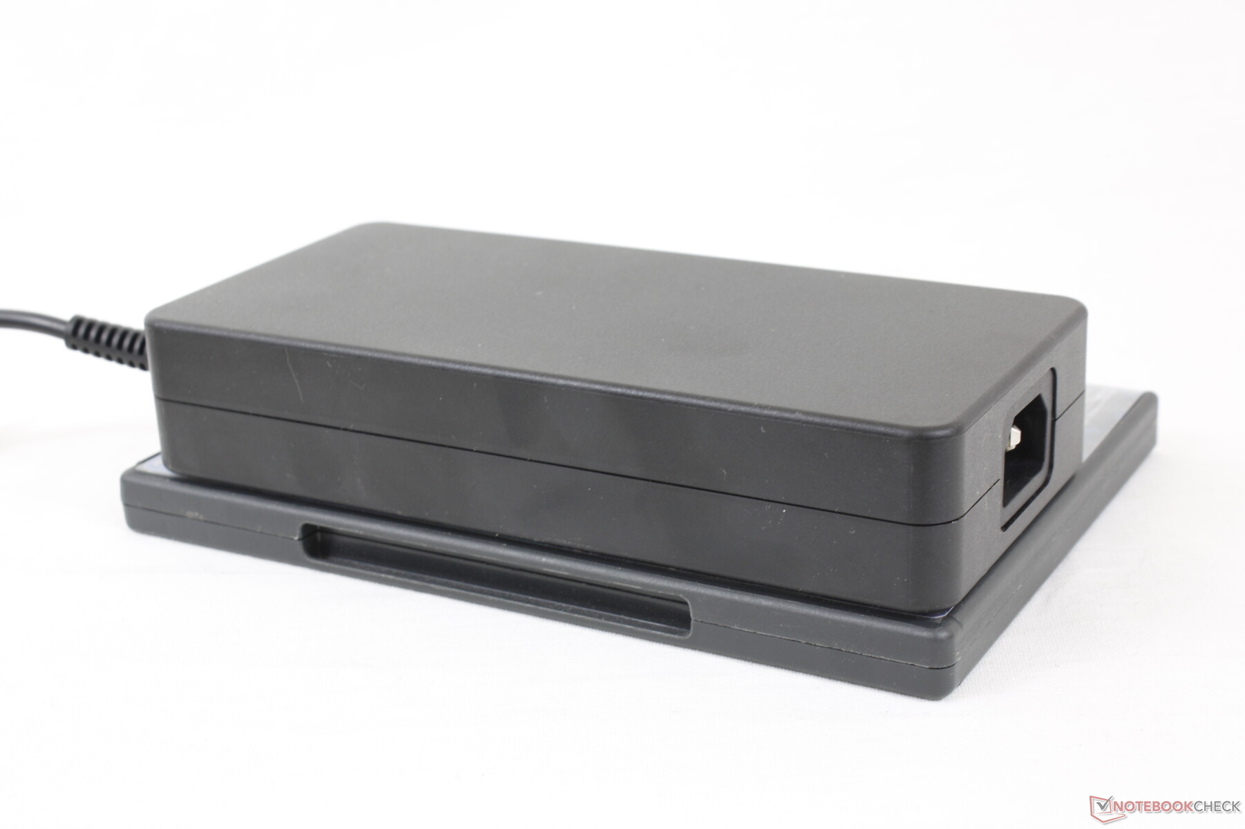 En av de största nackdelarna med GM7AG8P är dess stora 280 W-kloss som krävs för att driva de krävande processorerna inuti. Med nästan ett helt kilo är adaptern och tillhörande kablar lika tunga som vissa 15,6-tums Ultrabooks. Det är synd att systemet inte kan laddas via USB-C vilket tvingar ägarna att bära med sig den skrymmande adaptern när de reser. Däremot kan de bärbara datorerna Asus ROG Zephyrus och Alienware laddas via resevänliga USB-C-adaptrar från tredje part. Räkna med högt fläktljud även vid spelande vilket är ett gemensamt drag bland alla bärbara datorer för spel i just den här kategorin.