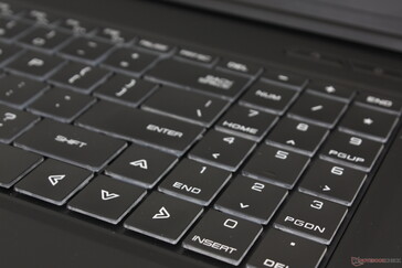 GM7AG8P använder traditionella membranbaserade tangenter som mer liknar XMG Core 17 eller XMG Pro 17 än de mekaniska tangenterna i XMG Neo 17. Till skillnad från de traditionella tangenterna på XMG Core 17 eller XMG Pro 17 är tangenterna här dock fysiskt större för att vara lättare att skriva på. Tangentåterkopplingen är jämn med relativt tyst skrammel mellan alla tangenter, men vi önskar att resan och återkopplingen kunde ha varit fastare överlag.