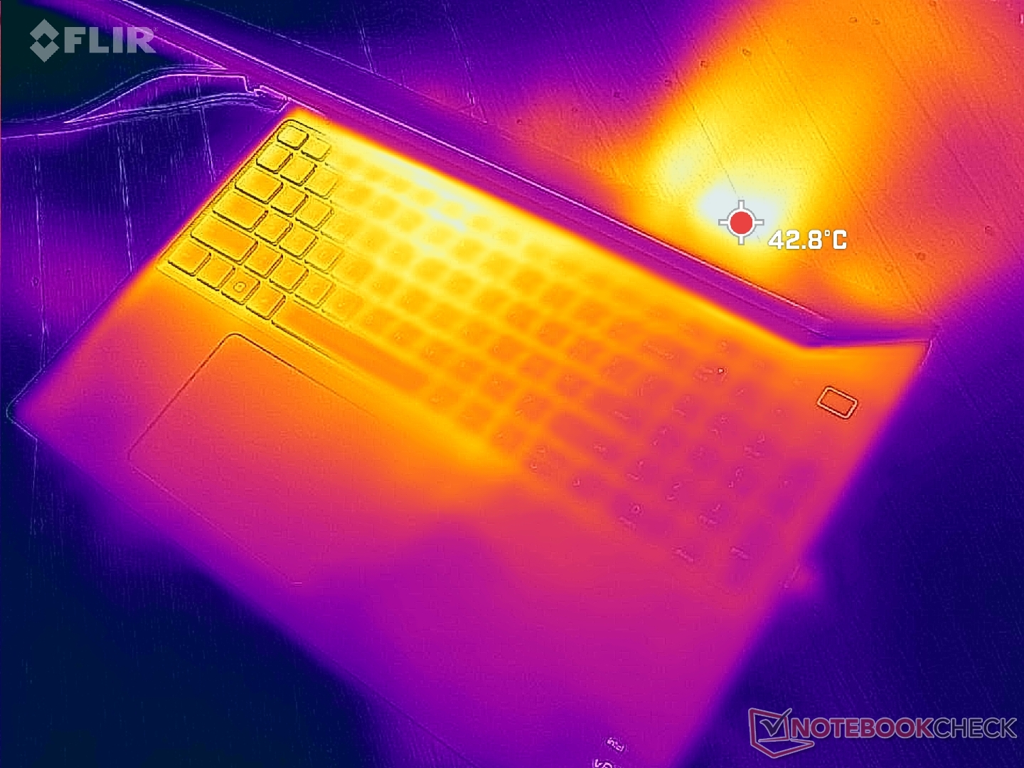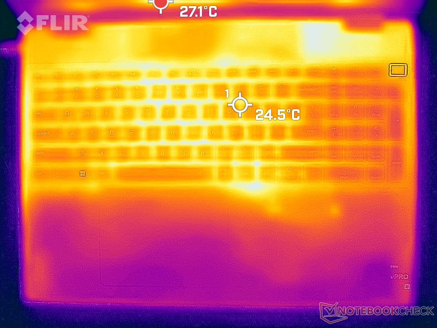 Yttemperaturerna är alltid varma oavsett belastning på skärmen. Vid tomgång i energisparläge skulle till exempel tangentbordsdäcket och -botten ligga på 30 C vardera jämfört med 26 C påLenovo ThinkPad P1 G4. Asus ProArt StudioBook Pro 16 kan vara ännu varmare med nästan 35 C under liknande förhållanden.