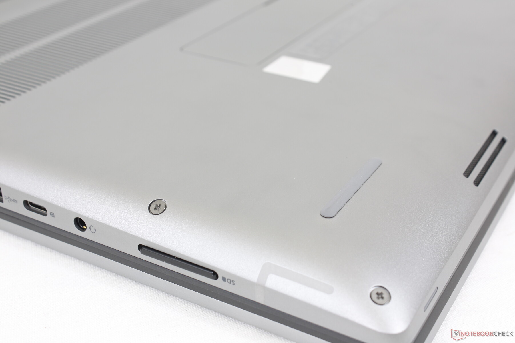 Bottenpanelen är säkrad med 6 Philips-skruvar för enkel service. Användarna har tillgång till två M.2 PCIe4 x4 2280-fack, WAN-fack, Nano-SIM-fack och antingen SODIMM- eller CAMM-fack beroende på konfigurationen. WLAN-modulen är inte avtagbar.