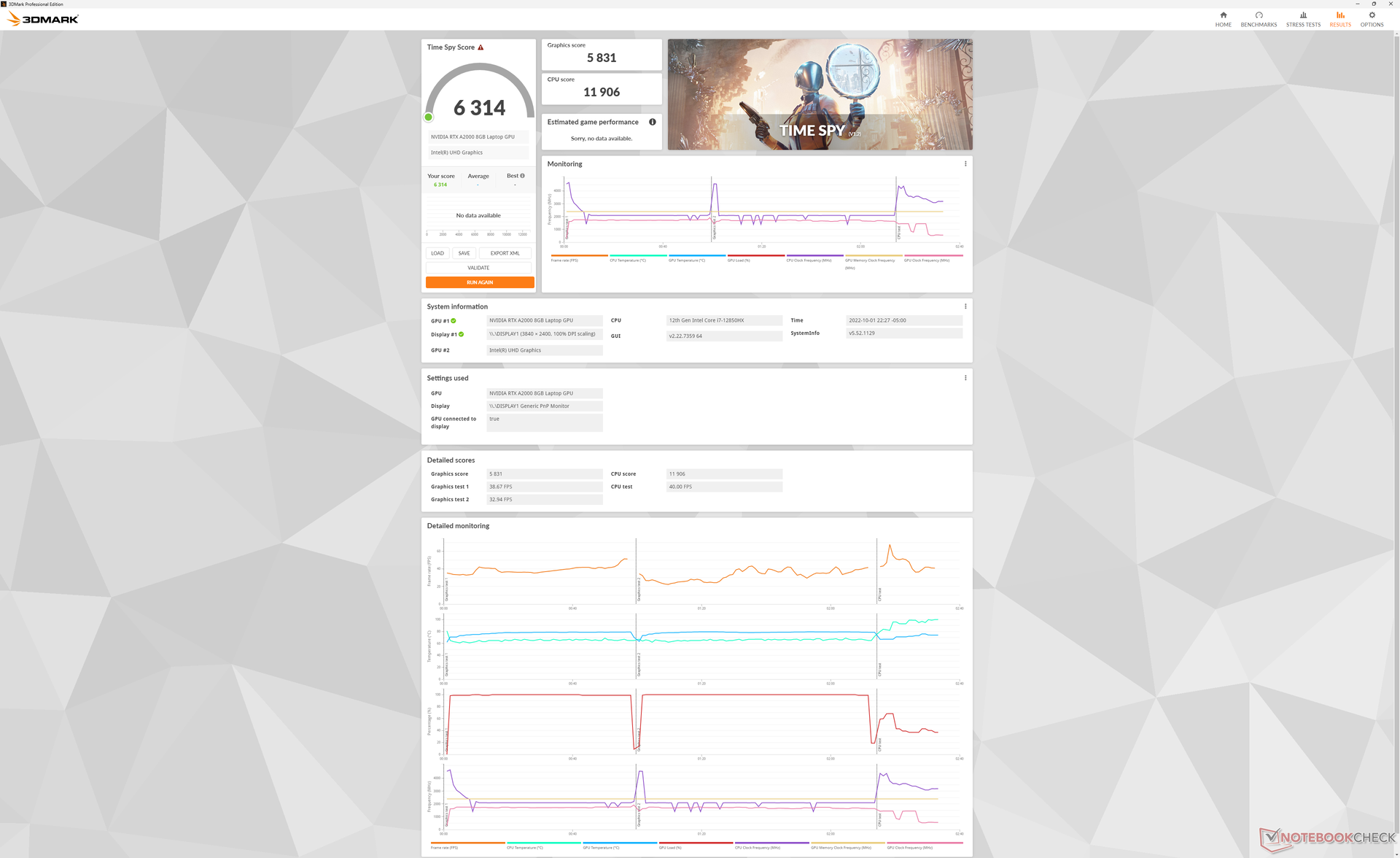 När vi kör Witcher 3 för att representera en stadig tung belastning skulle GPU-klockfrekvens, temperatur och strömförbrukning stabiliseras vid 1777 MHz, 80 C respektive 80 W, jämfört med 1462 MHz, 75 C respektive 45 W på den mindre Precision 5560 med samma RTX A2000 GPU.