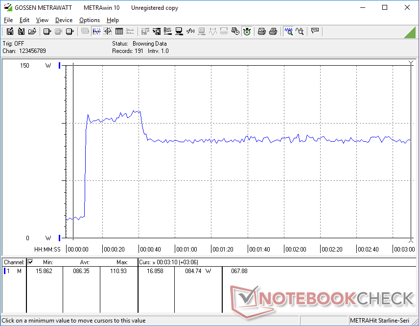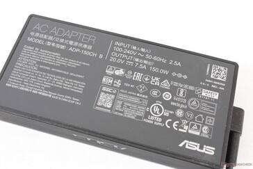 Vi kan mäta ett tillfälligt maximalt uttag på 111 W från den små-medelstora (~13,8 x 6,8 x 2,4 cm) 150 W AC-adaptern när vi kör Prime95 och FurMark samtidigt.