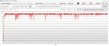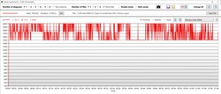 Kärnorna börjar vårt stresstest på över 3,8 GHz. Klockfrekvenserna sjunker långsamt och det förekommer periodvis mindre nedgångar, varvid den termiska gränsen för Pro 15 tydligen inte träder in förrän mycket sent. Den genomsnittliga kärntemperaturen ligger således på höga 95 °C! Samtidigt är en ganska hög genomsnittlig klockfrekvens på cirka 3,2 GHz möjlig.