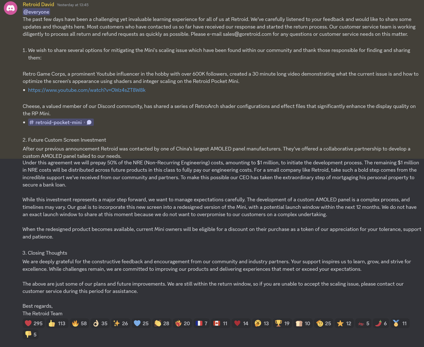 Som Retro Game Corps video ovan går in i mer detalj, doxxades sedan Retroids representant för sociala medier i väst av ägare som var missnöjda med Retroids svar. Efter sin avgång har Retroid tillhandahållit en lång uppdatering för Pocket Mini framöver.