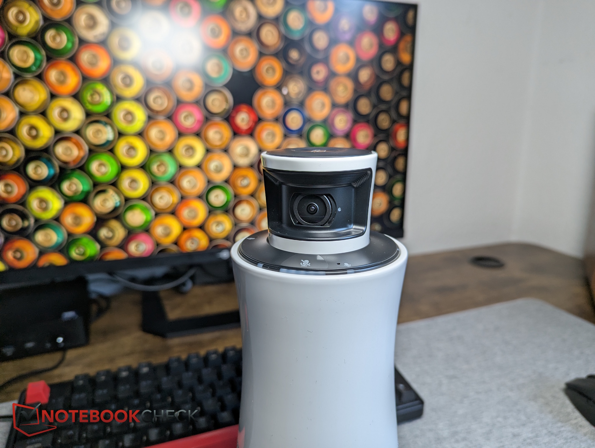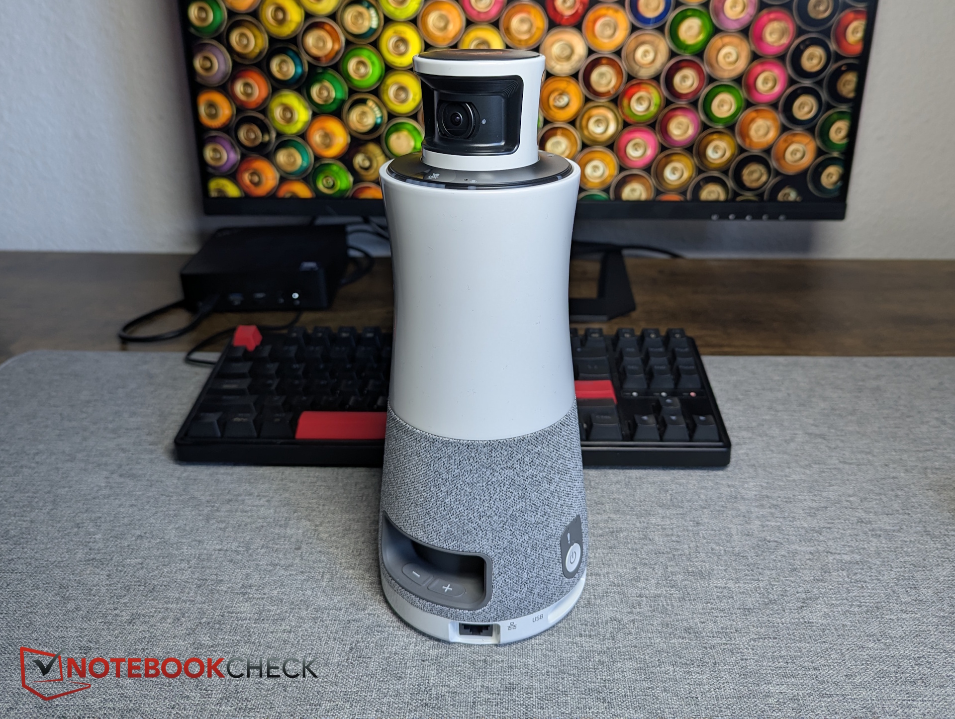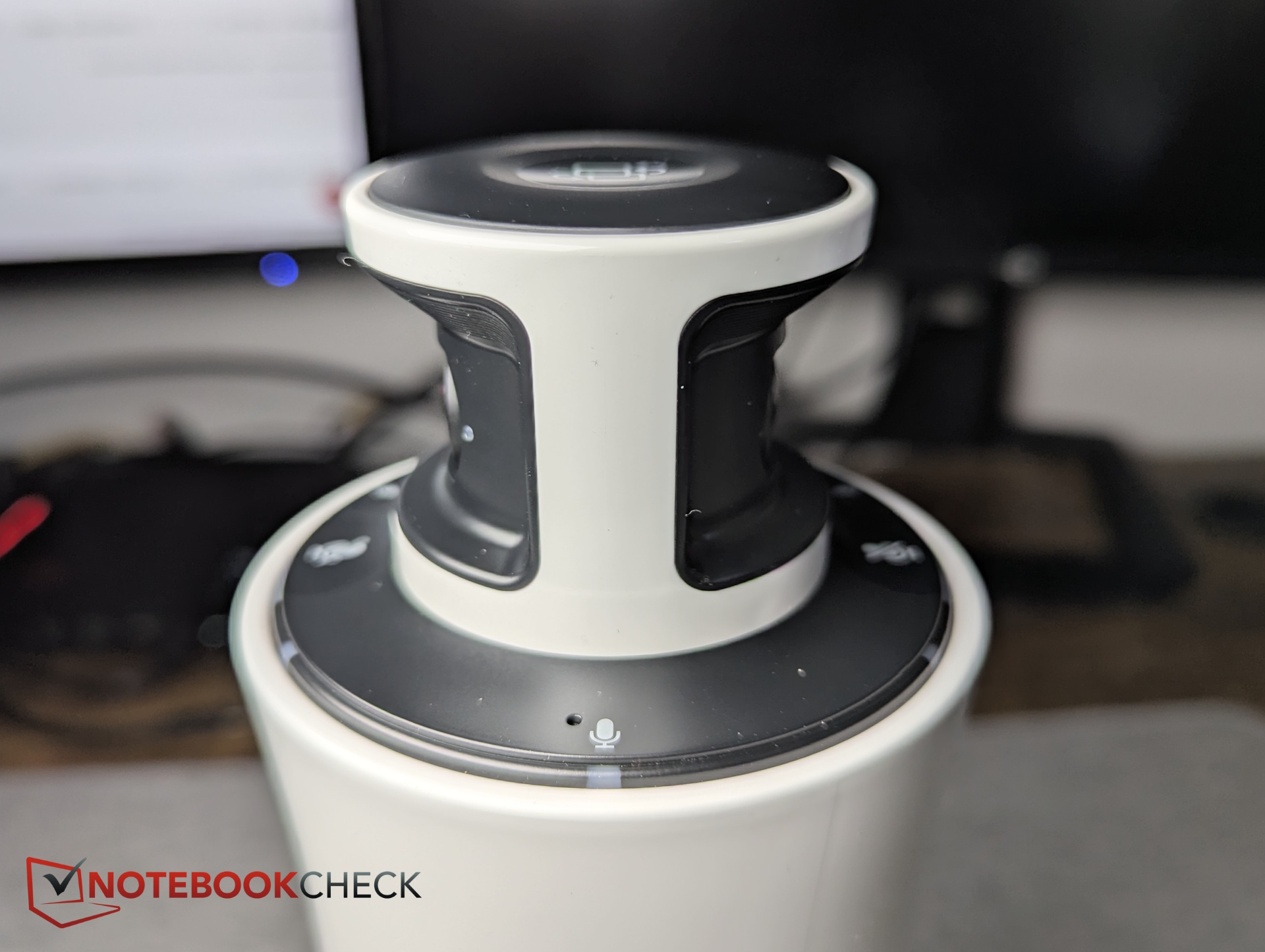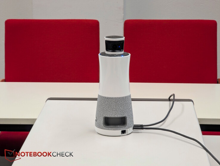 Det kolonnformade plasthöljet placerar de två 180-graders kamerorna högst upp. Detta är logiskt eftersom kamerorna höjer sig över bärbara datorskärmar och andra hinder och placerar dem nära ögonhöjd utan att blockera deltagarnas siktlinje till varandra. De tre mikrofonerna är också placerade högst upp.