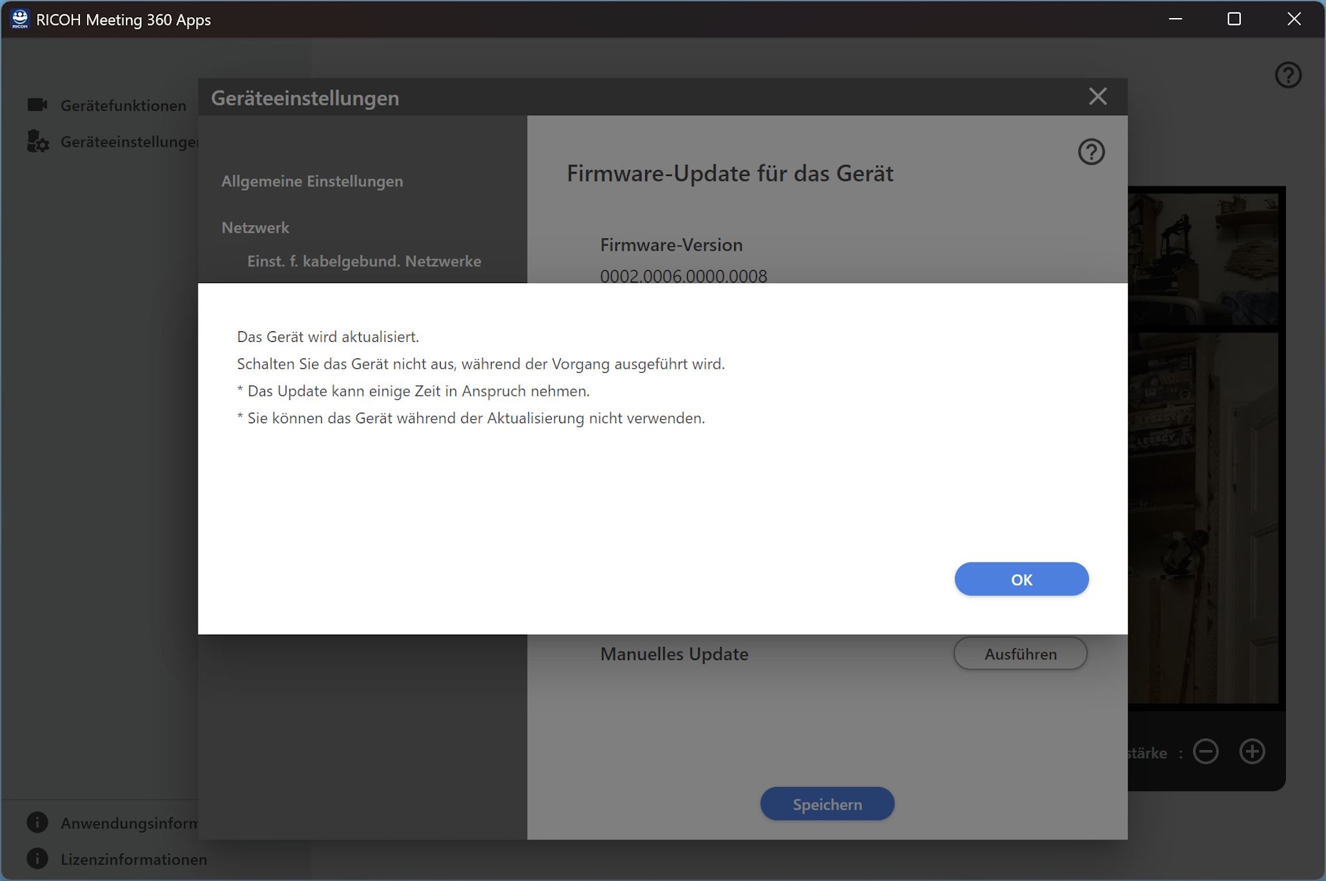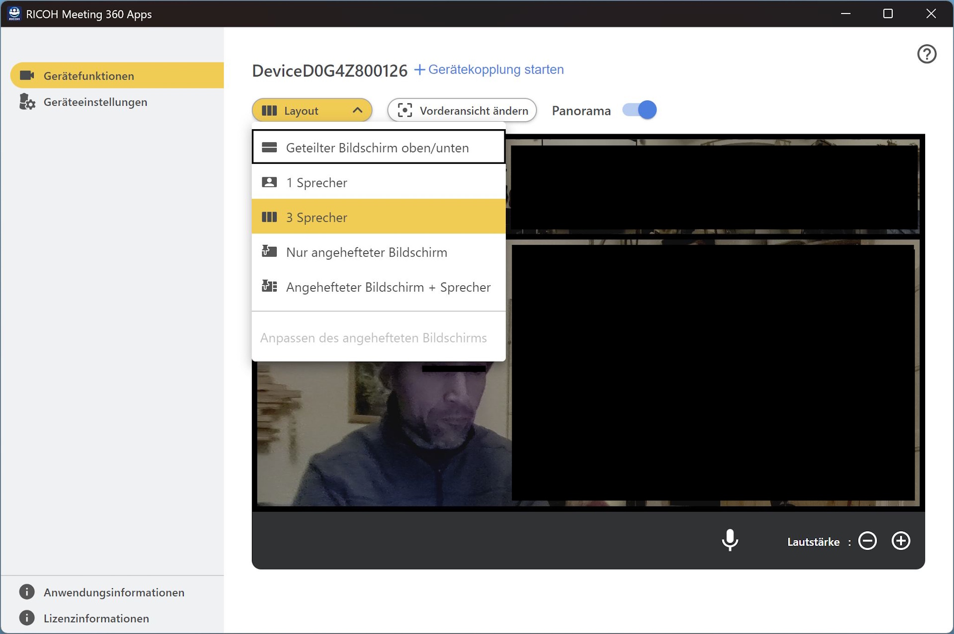 Ricoh tillhandahåller även appen Ricoh Meeting 360. Därifrån kan användarna initiera uppgraderingar av firmware (enheten måste först anslutas via LAN), konfigurera layoutpreferenser och justera andra inställningar.