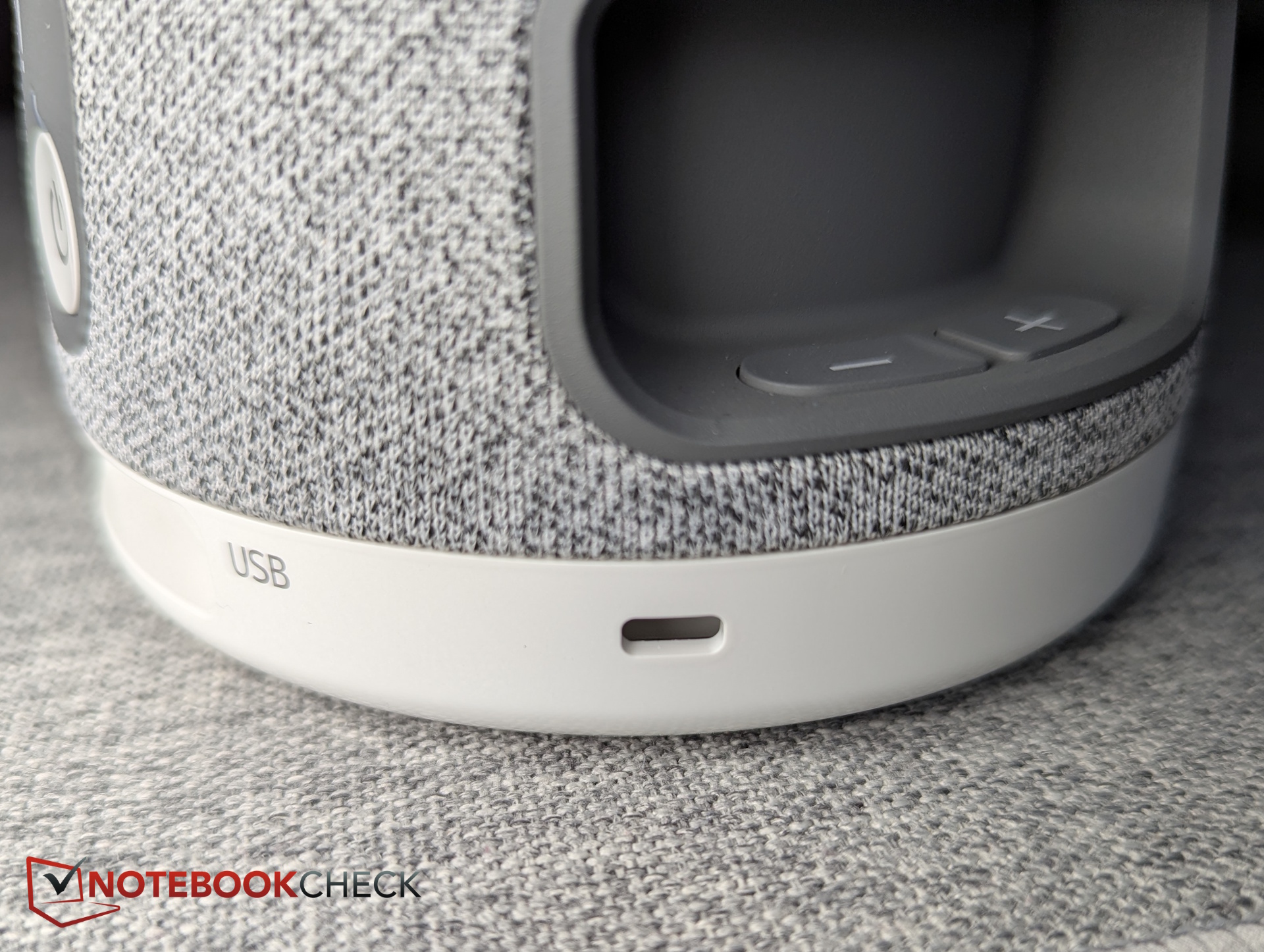 I den nedre tredjedelen sitter tre högtalare som är klädda i grått tyg. Volymknapparna är placerade på båda sidor av enheten. Alla portar är placerade längst ned.