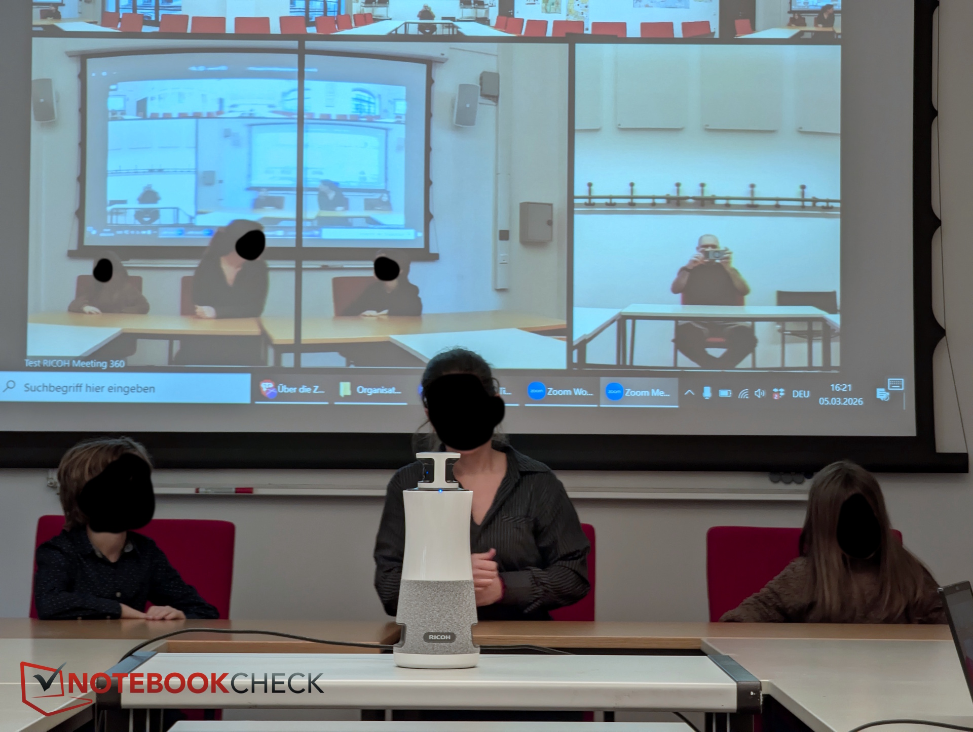 I en videokonferens fångar Ricoh Meeting 360 Hub, som är plug-and-play, på ett tillförlitligt sätt den aktiva talaren och alla andra deltagare i rummet med sitt panoramiska synfält. Bild- och ljudkvaliteten (via Zoom, Teams etc.) är övertygande på normala avstånd och under goda ljusförhållanden. Systemet fungerar bäst i små till medelstora konferensrum.